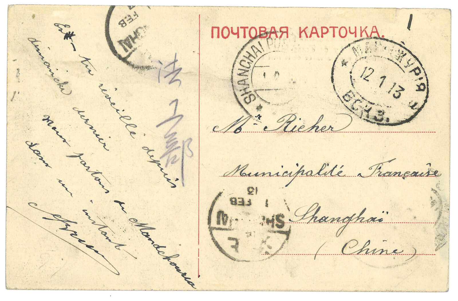 1913 Manchouli Station (12 Jan) to Shanghai. Picture postcard, f.w. Coat of Arms 4k, tied by Manchouli Station T&S type 2 oval d.s. Transit Shanghai Russian PO (1 Feb). Arrived Shanghai Chinese PO (1 Feb).
