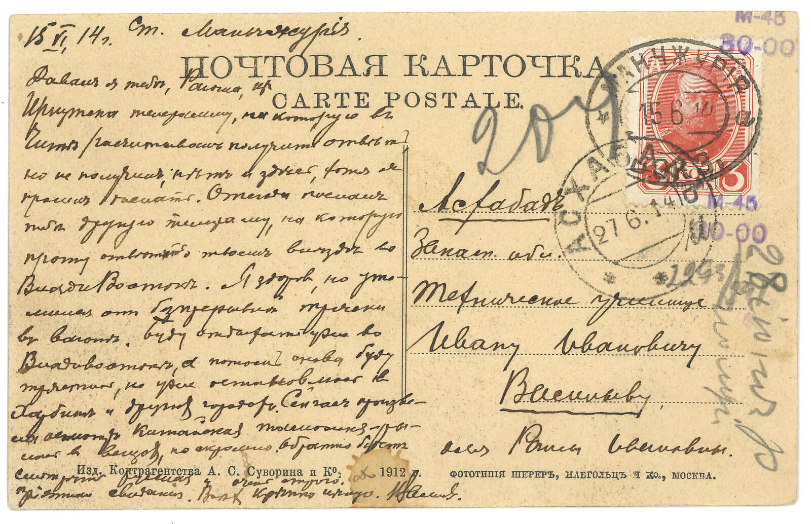 1914 Manchouli Station (15 Jun) to Russia. Picture postcard, f.w. Romanov 3k, tied by Manchouli Station T&S type 2 oval d.s. Arrived Ashgabat (27 Jun). Scarce destination in nowadays Turkmenistan. Franking of Romanov issue