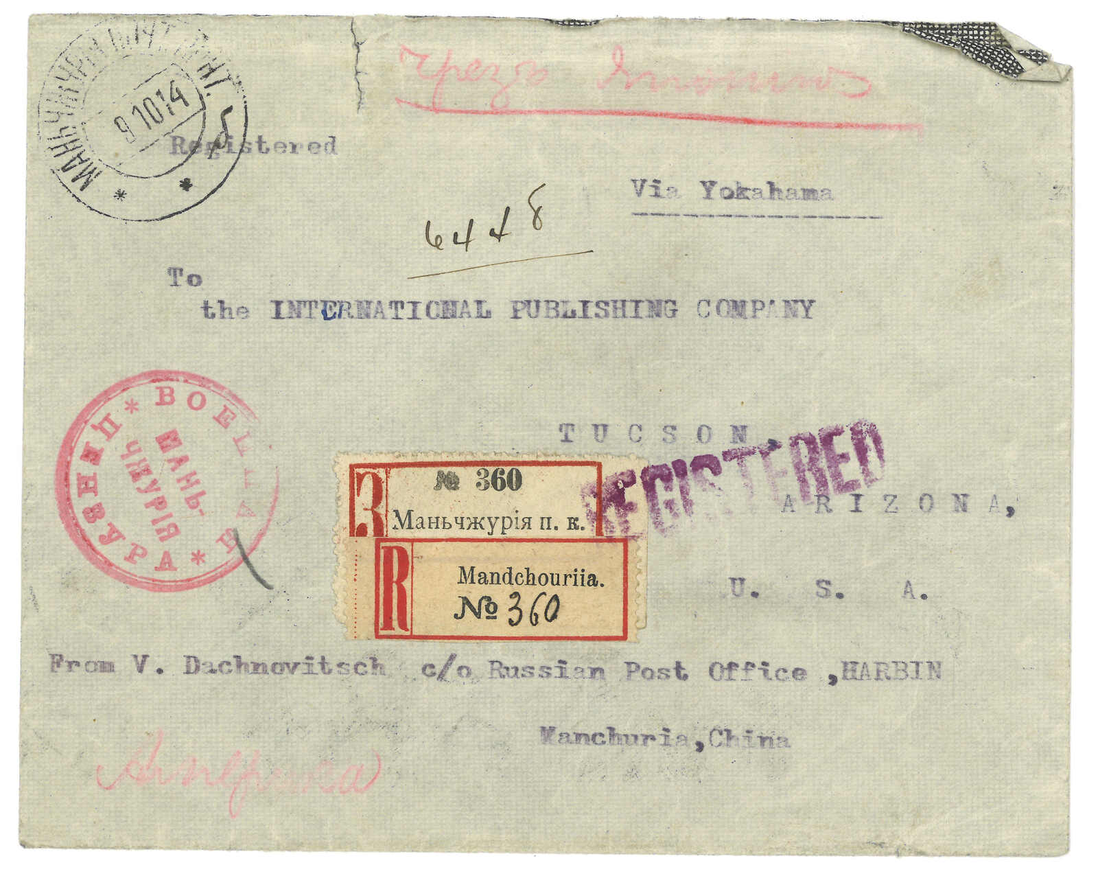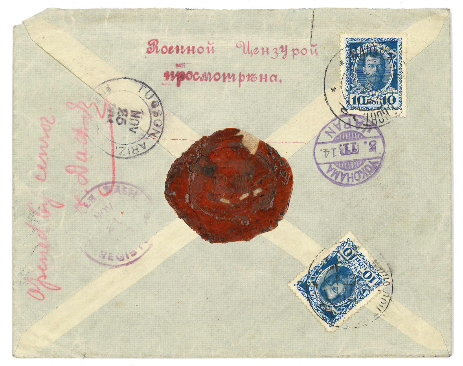 1914.10.9 滿洲里寄美國。掛號封,背貼羅曼諾夫10戈比x2,銷少見之滿洲里俄局T&S 1b型日戳。正見掛號標籤及3型檢查圓戳。背面則鈐未記載之兩行檢查橫戳。11.5經橫濱,11.21經西雅圖。11.25抵Tuscon。(Image 1)