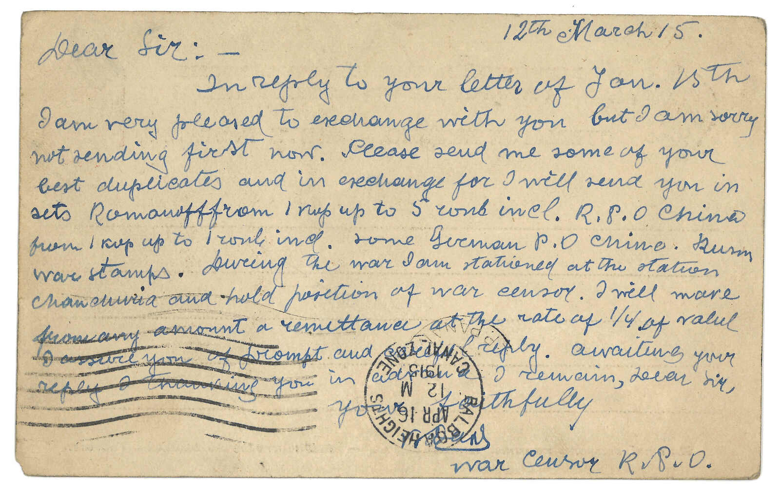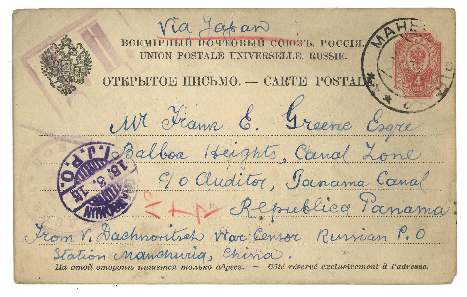 1915 Manchouli (12 Feb) to Panama. Russian 4k PSC, tied by Manchouli Town Russian PO T&S type 2b cds. alongside with type 3 circular and type 4 framed censor mark. Transit Yokohama (15 Mar). Arrived Panama (16 Apr). Scarce
