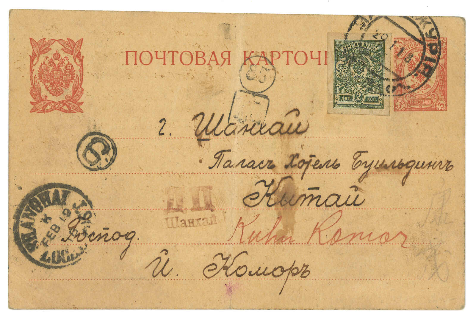 1918.1.29 滿洲里寄上海。俄國3戈比郵資片,加貼無齒3戈比,銷滿洲里俄局2b型日戳。另鈐未記錄之上海俄局檢查章。2.19抵上海工部郵局。不論是貼用無齒票、上海俄文檢查章及經上海工部郵局送遞都十分難得少見。(Image 1)