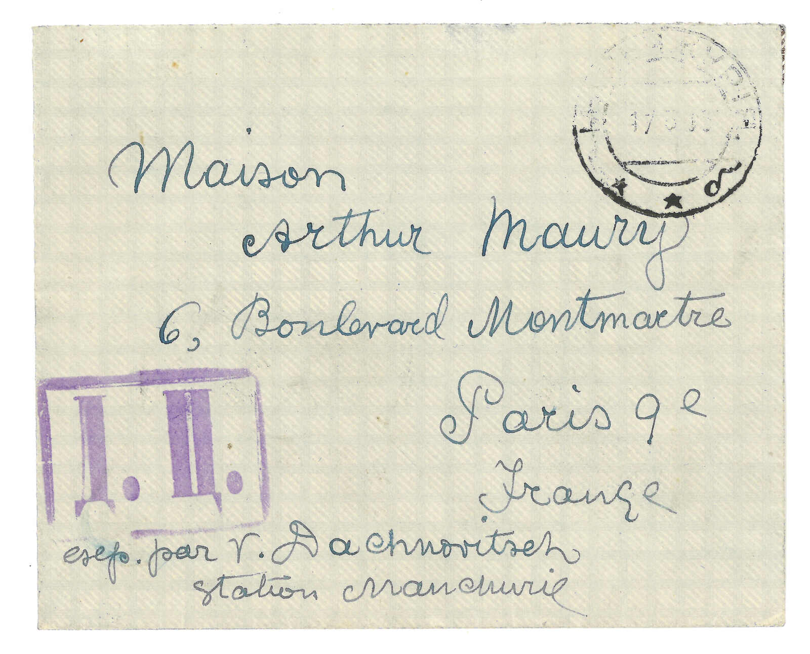 1915.6.17 滿洲里寄法國,背貼羅曼諾夫1戈比 + 2戈比 + 7戈比,銷滿洲里俄局T&S 2b型日戳,旁鈐3型圓形及4型長方形檢查章。T&S指羅曼諾夫1戈比及2戈比銷滿洲里俄局日戳十分稀罕。(Image