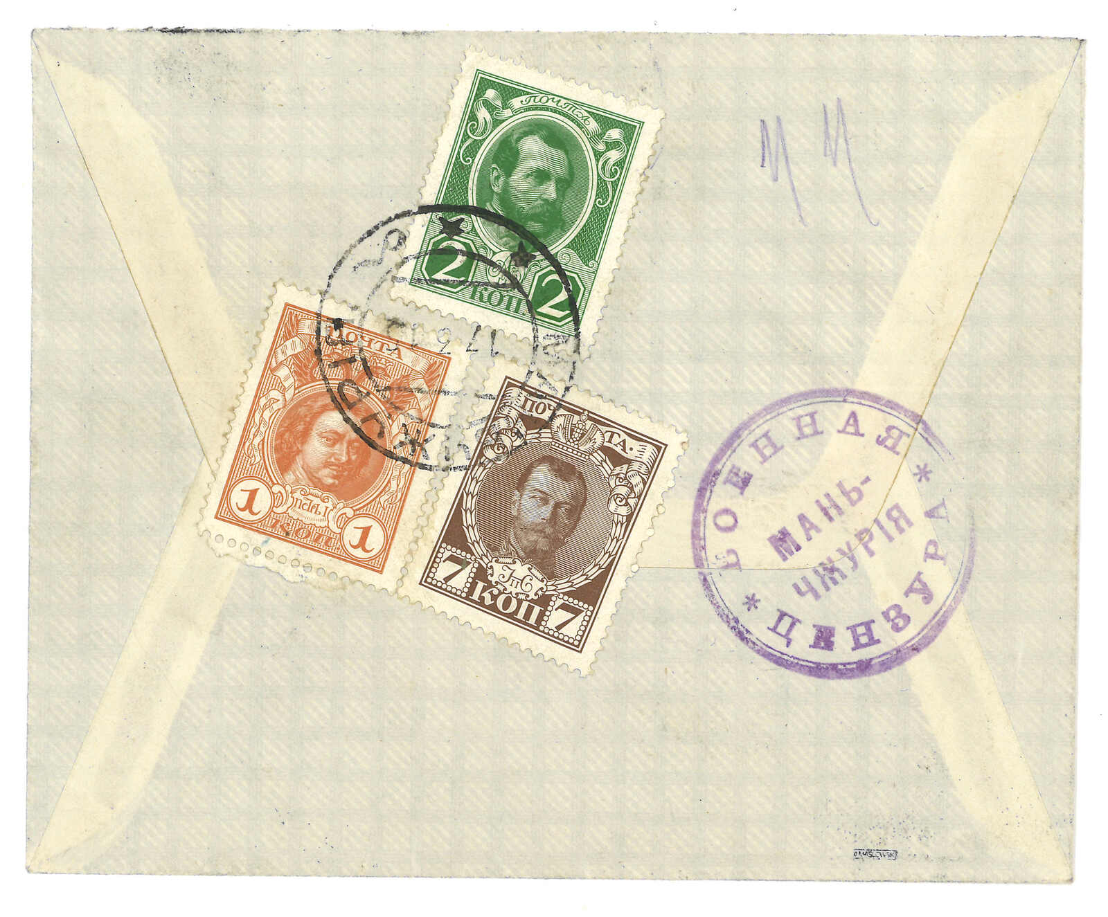 1915 Manchouli (17 Jun) to France, f.w. Romanov 1k + 2k + 7k, tied by Manchouli Town Russian PO T&S type 2b cds., along with type 3 circular and type 4 rectangular censor mark. T&S recorded that Manchouli Town cds is