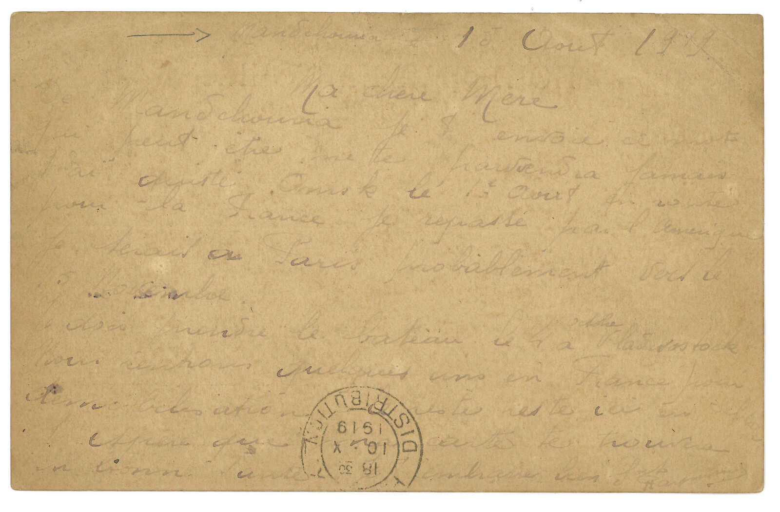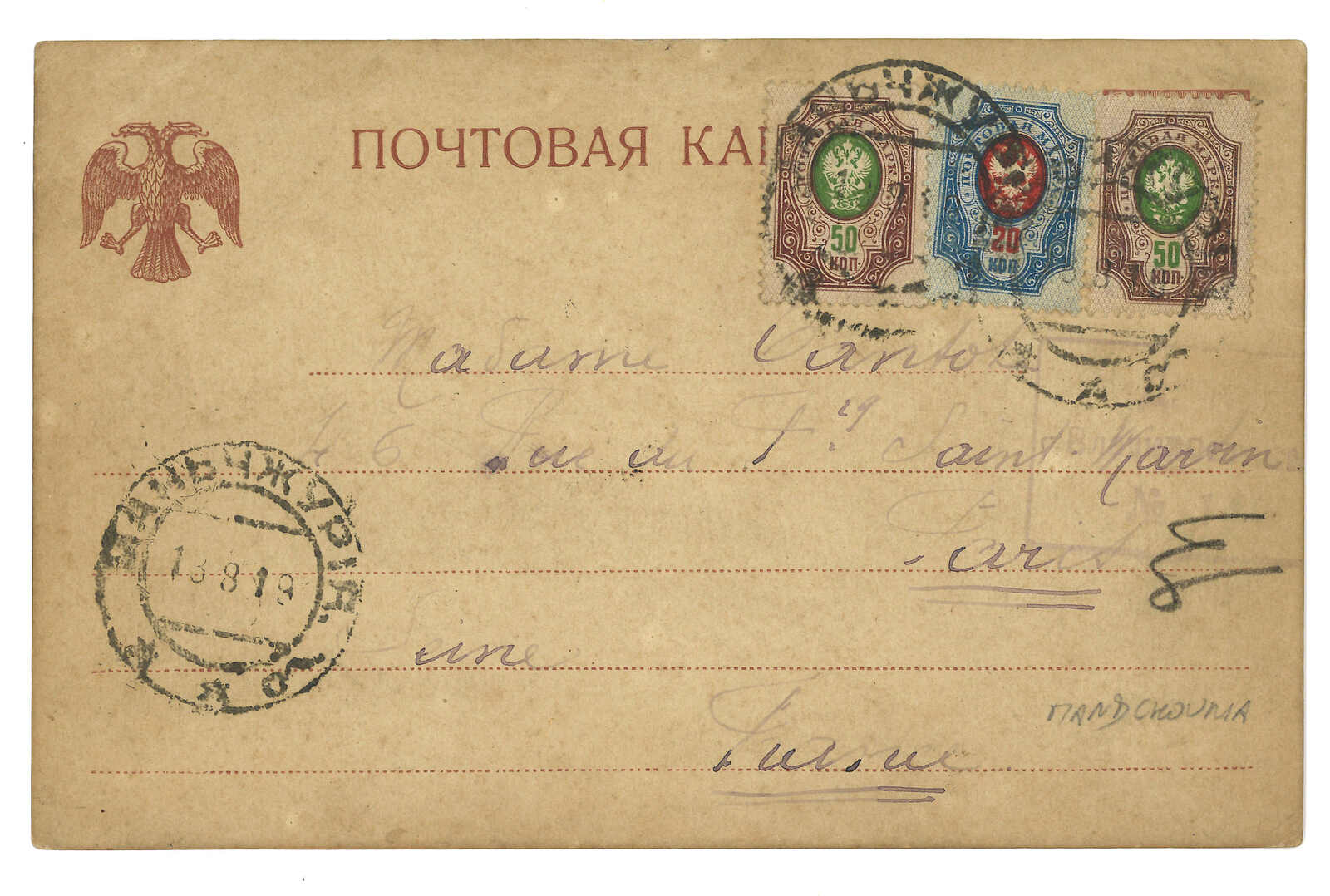 1919 Manchouli (13 Aug) to France. Postcard, f.w. Coat of Arms 20k + 50k x2, tied by Manchouli Town Russian PO T&S type 2b cds. Arrived Paris.