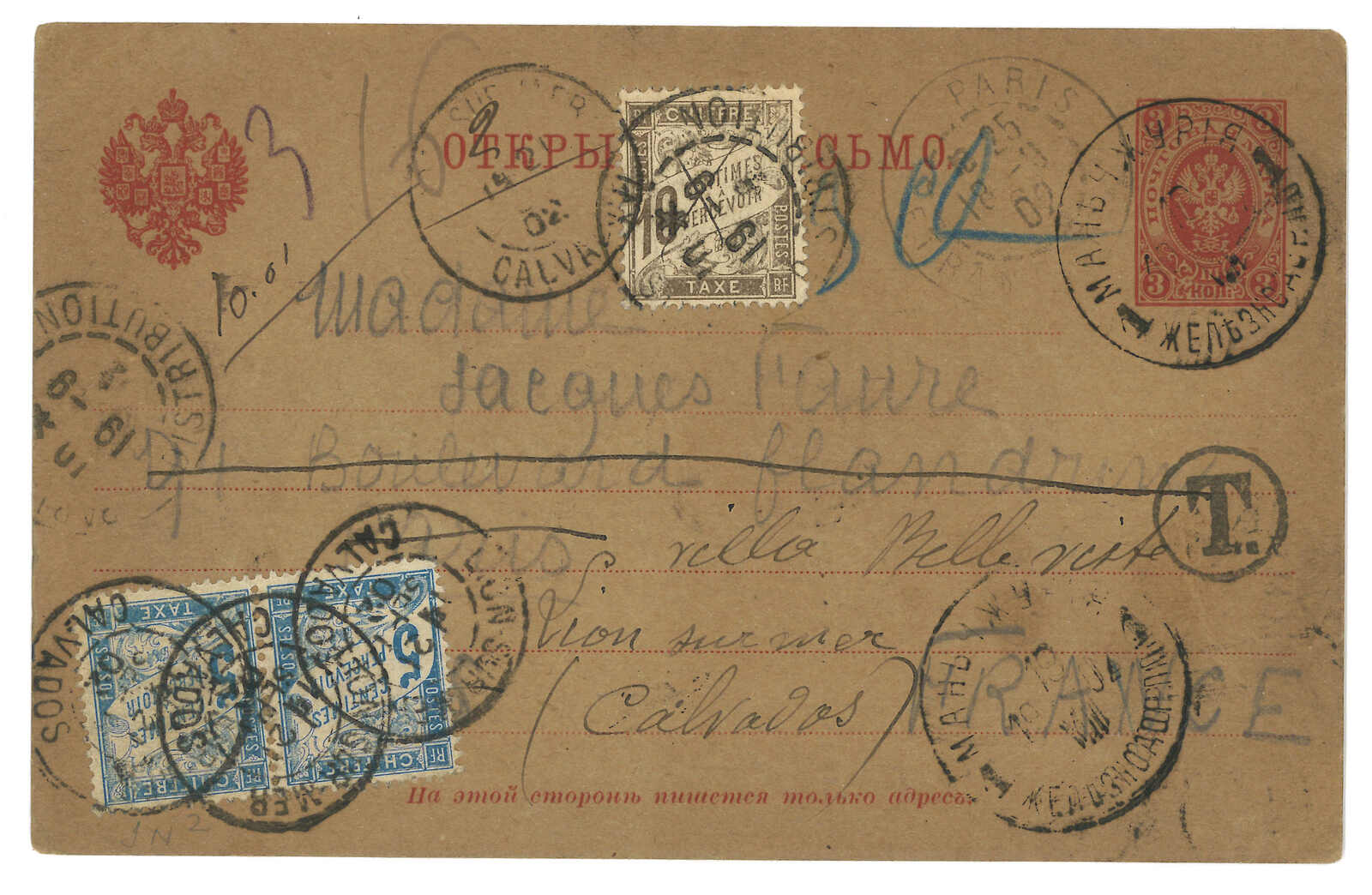 1902.8.18 滿洲里車站寄法國。俄國3戈比郵資片,銷少見難得之滿洲里車站T&S 1型日戳。9.18經巴黎。貼法國欠資票5生丁雙連 + 10生丁,銷Calvados