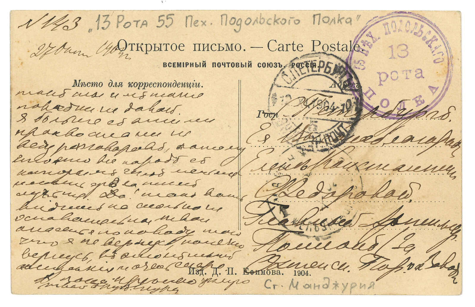 1904 Manchouli Station (Oct) to Russia. Picture postcard, frankless, applied with scarce Manchouli Station T&S type 1 cds and "13th Company of 55th Infantry Regiment" circular seal. Arrived St. Petersburg (12 Nov). The