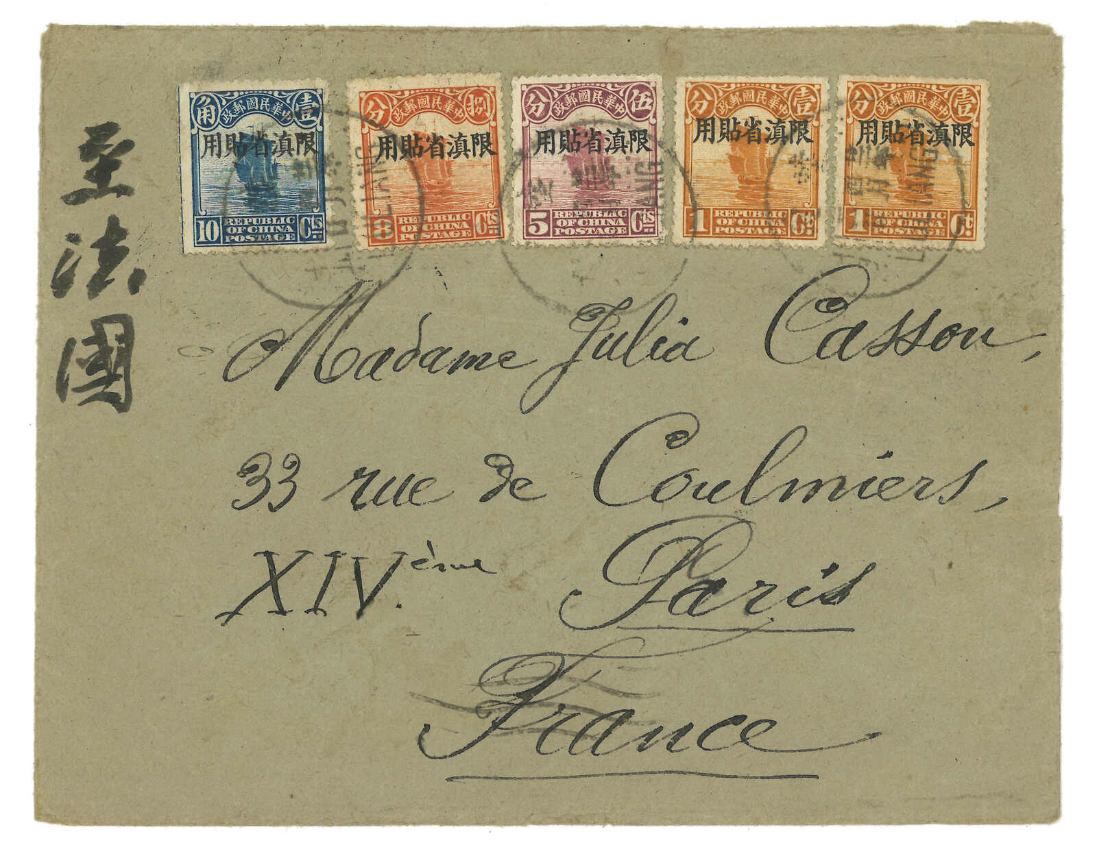 3401 cover image1933 Luliang (2 Apr) to Fracne, f.w. Junk ovpt. Limited For Use in Yunnan 1c x2 + 5c + 8c + 10c, tied by Luliang bilignual cds. Transit Hokow (4 Apr), Haiphong. Arrived Paris (14 May).