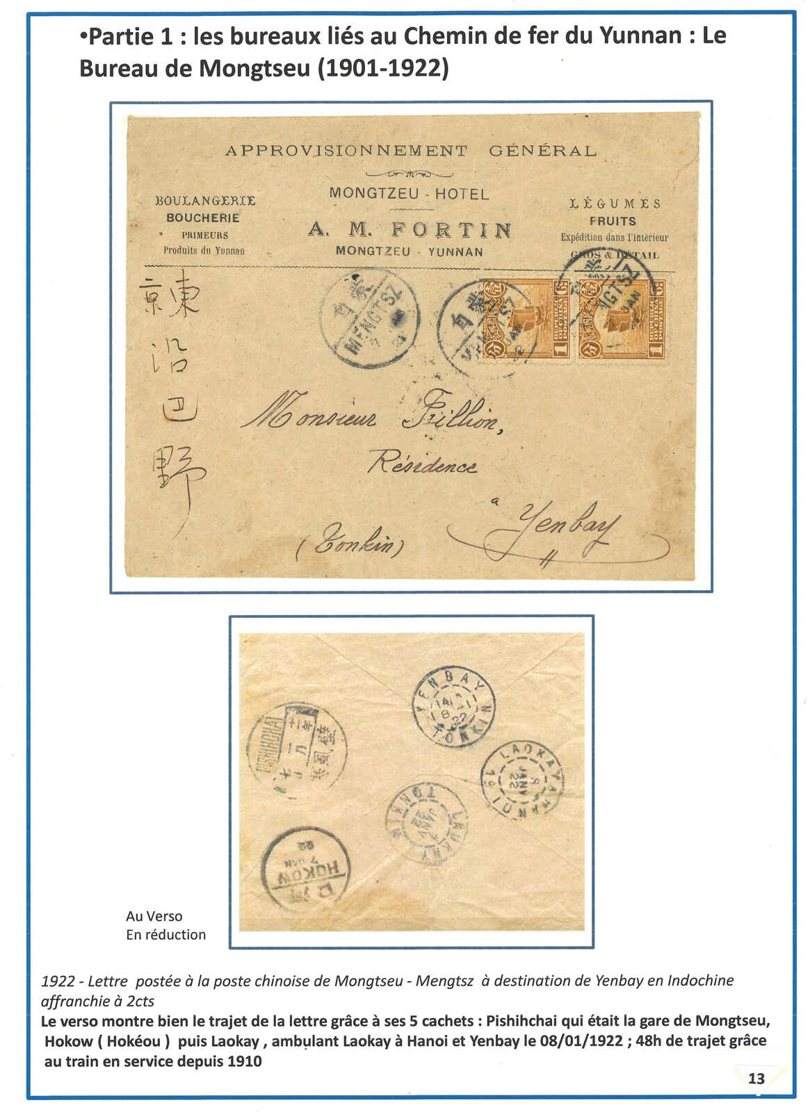 3418 cover image1928 (20 Jan) Cover posted at Yunnanfu-Hokow Railway TPO to France, f.w. Junk ovpt. Limited For Use in Yunnan 10c, tied by Yunnanfu-Hokow Railway TPO cds. Transit Hokow (21 Jan), Haiphong (23 Jan).