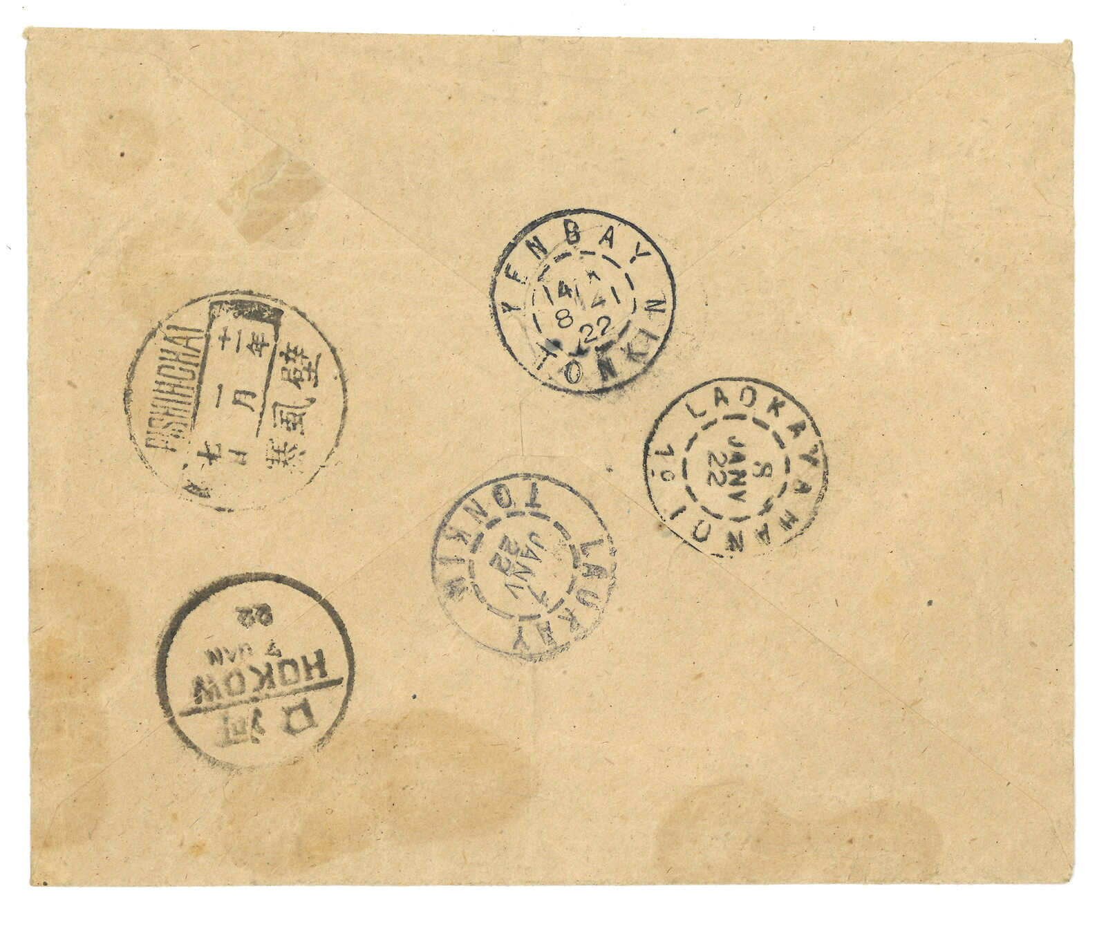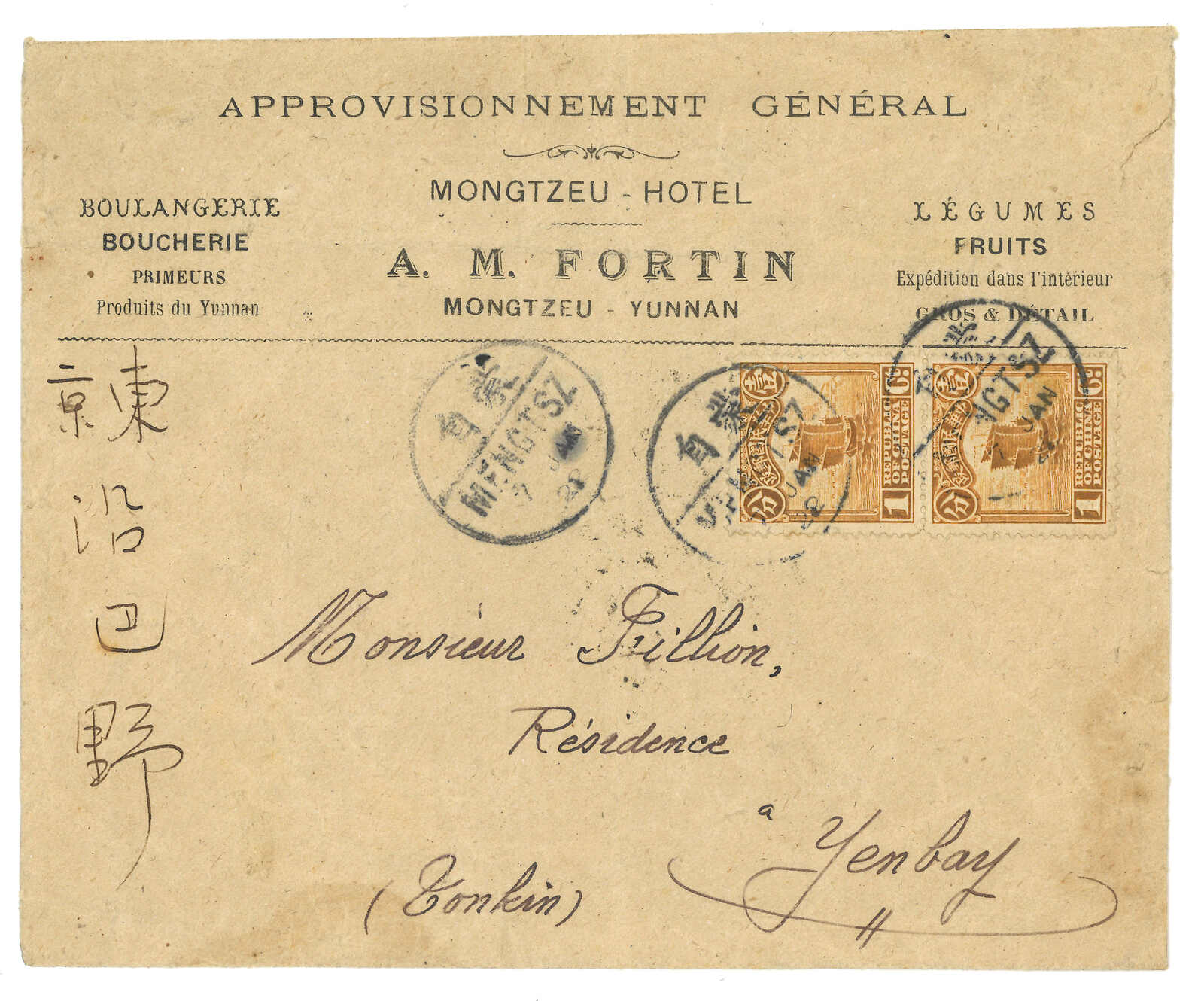 3416 cover image1922 Mengtsz (7 Jan) to Yenbay, Tonkin, f.w. Junk 1c in pair, tied by Junk 1c in pair for printed matter rate, tied by Mengtsz bisected bilingual cds. Transit Pishihchai (7 Jan), Hokow (7 Jan), Laokay (7 Jan). Arrived Yenbay (8 Jan). Short delivery time reflecting the efficiency of Vietnam-Yunnan Railway.