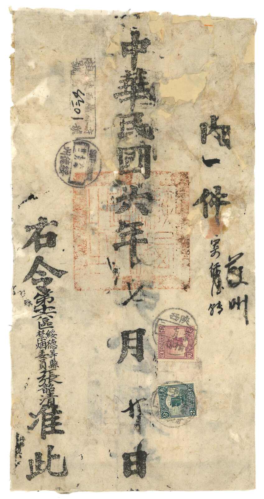324 cover image1917 Shensi Yulin Circuit Intendant large official cover registered to Suiteh, f.w. Junk 3c + 5c, tied by Shensi Yulinfu cds, alongside with registered mark. Arrived Shitehchow (22 Jul).
