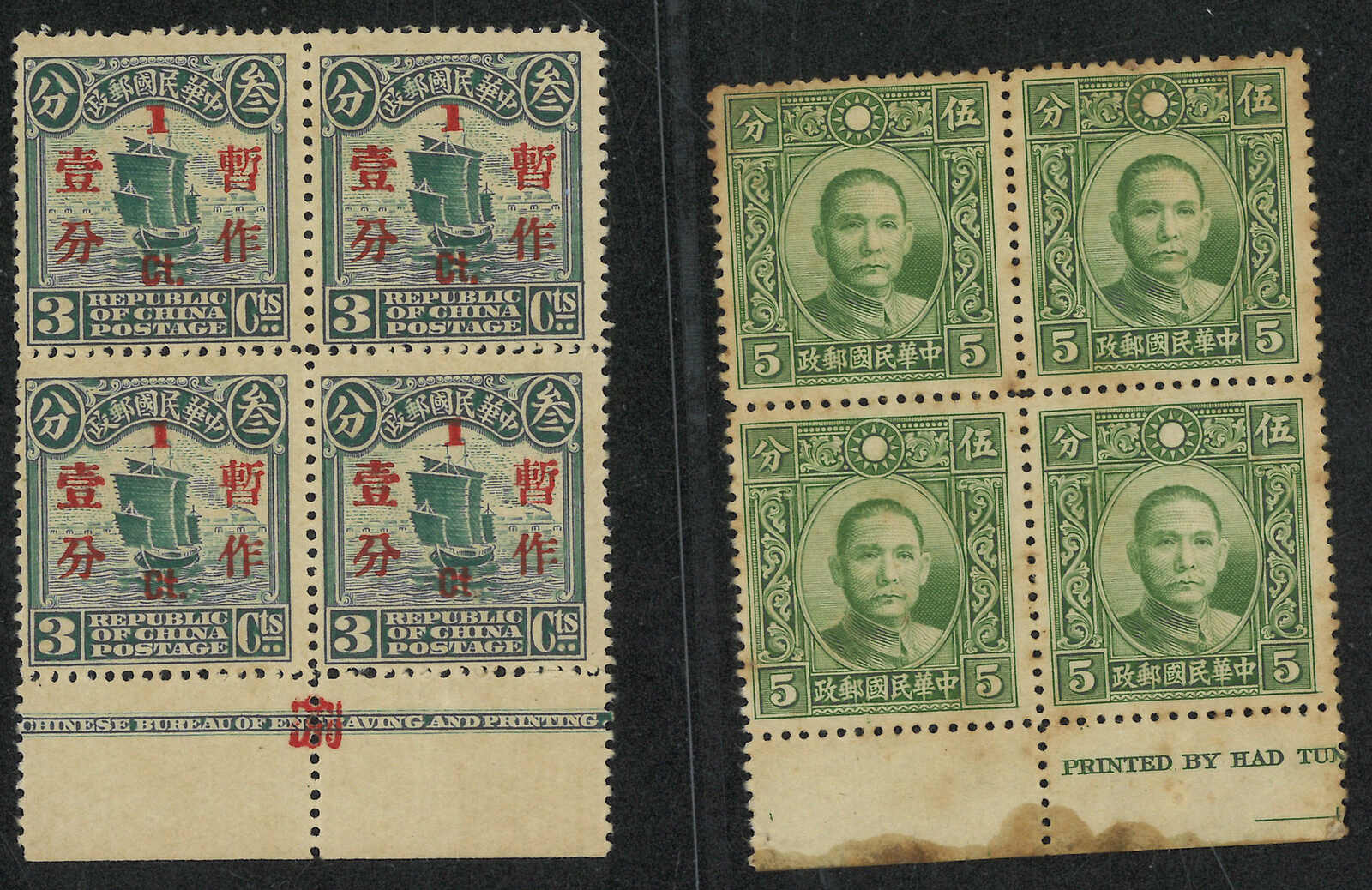 312 o/bof imageA pair of Junk and SYS variety stamp in block of 4. Former 1930 Peking 1std Print Junk surch 1c/3c, bottom right stamp with no stop after "Ct." (Chan 282 var). Latter 1940 Dah Tung Print SYS 5c with "HAD" instead of "DAH" on marginal inscription (Chan 403d). Both mint.