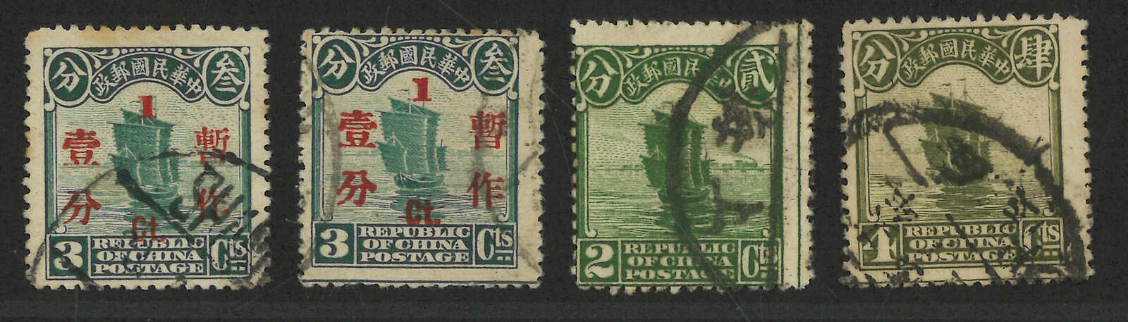 帆船及其加蓋暫作壹分舊票一組4枚,均帶輕微齒孔移位變異。(Image 1) (Image 2)