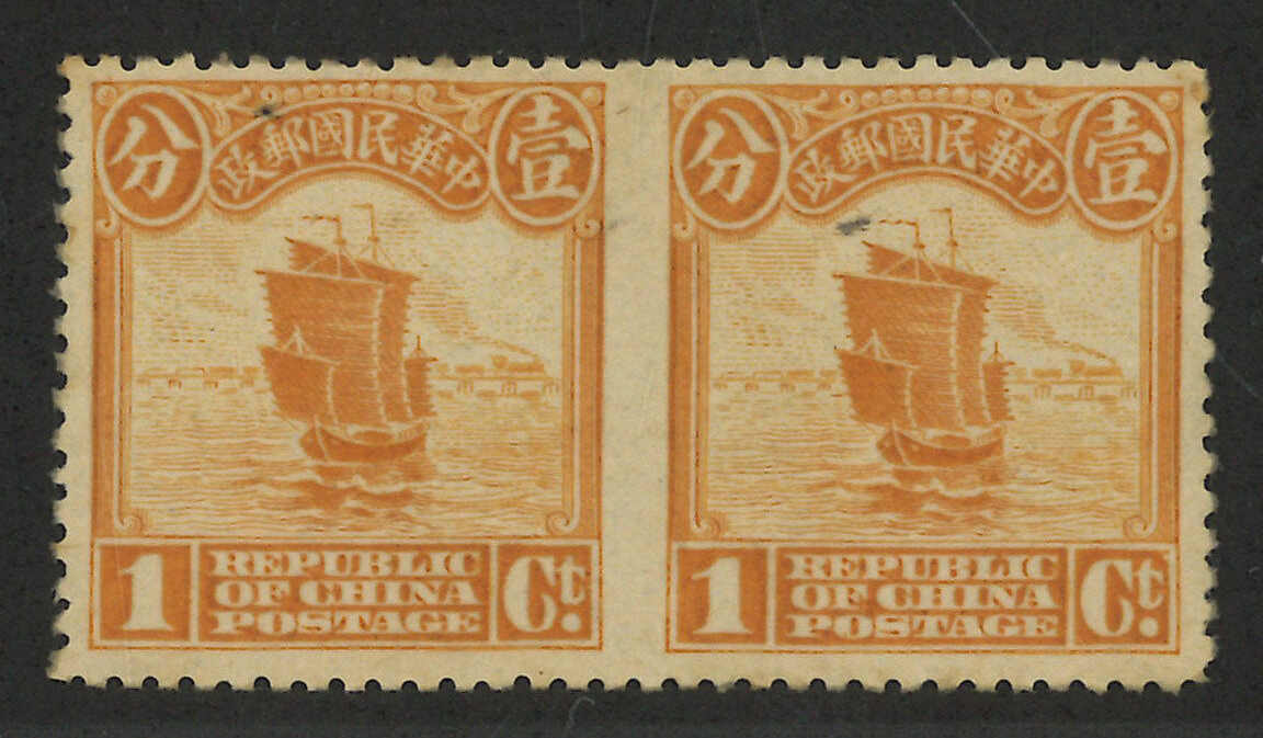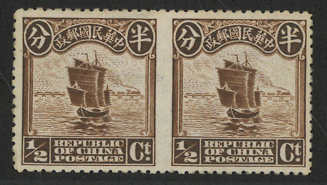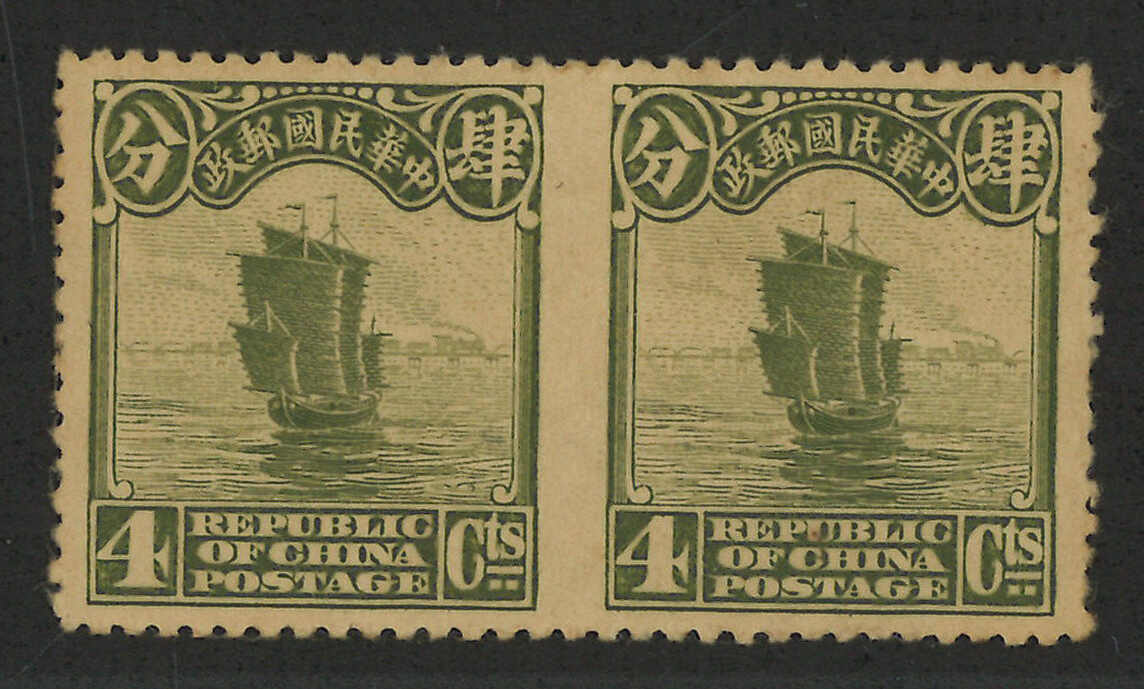 1923至1933年北京二版帆船4分橫雙連新,帶中縫漏齒變異(陳目254a),原膠背貼。(Image 1) (Image 2)
