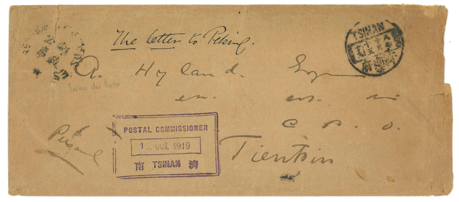 322 cover image1917 Tsinan (15 Oct) to Tientsin. On Service cover, frankless and applied with "SERVICE DES POSTE" bilingual circular mark, "POSTAL COMMISSIONER TSINAN" rectangular d.s. and Tsinan bilingual cds. Arrived Tientsin (16 Oct).