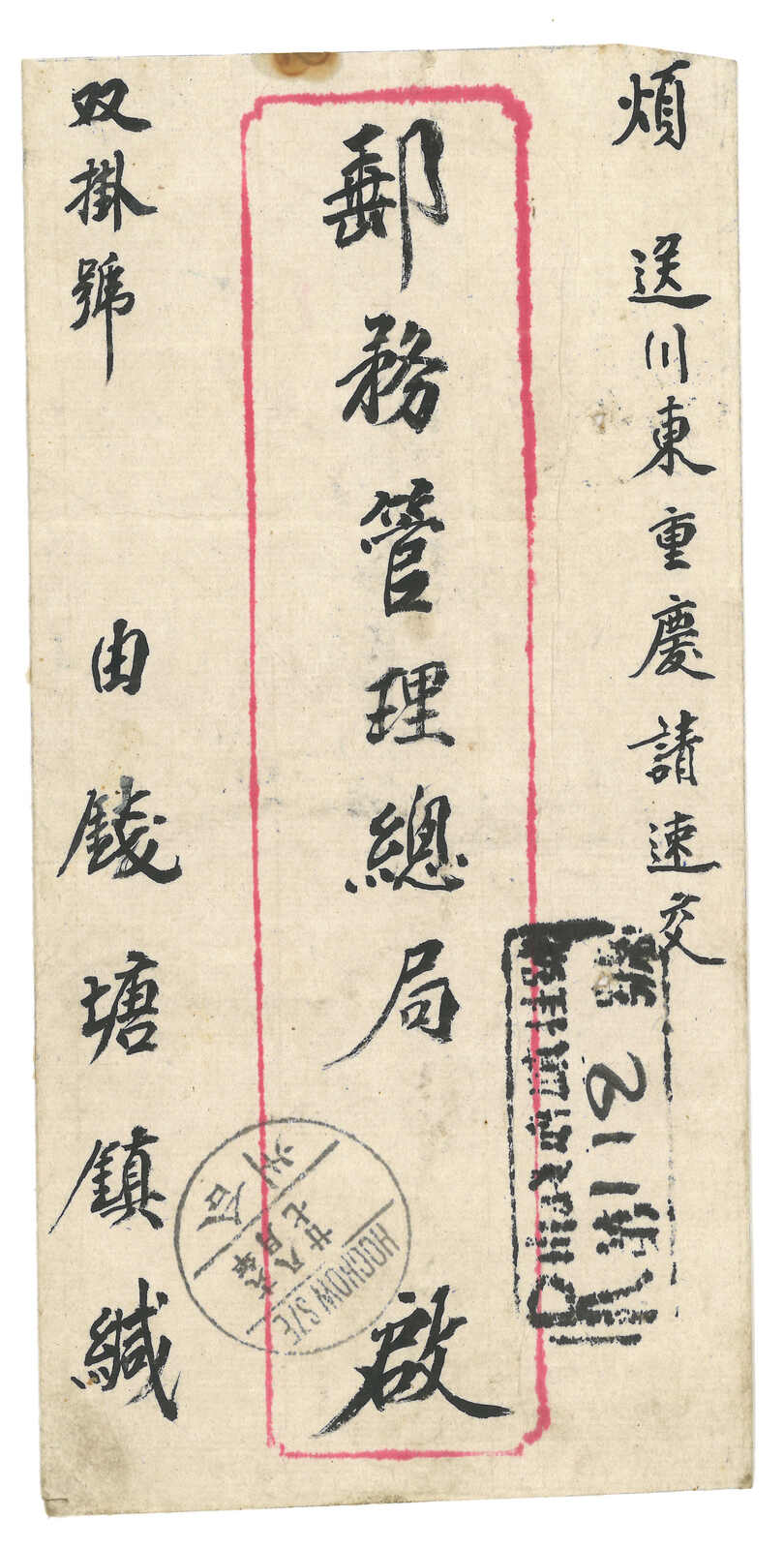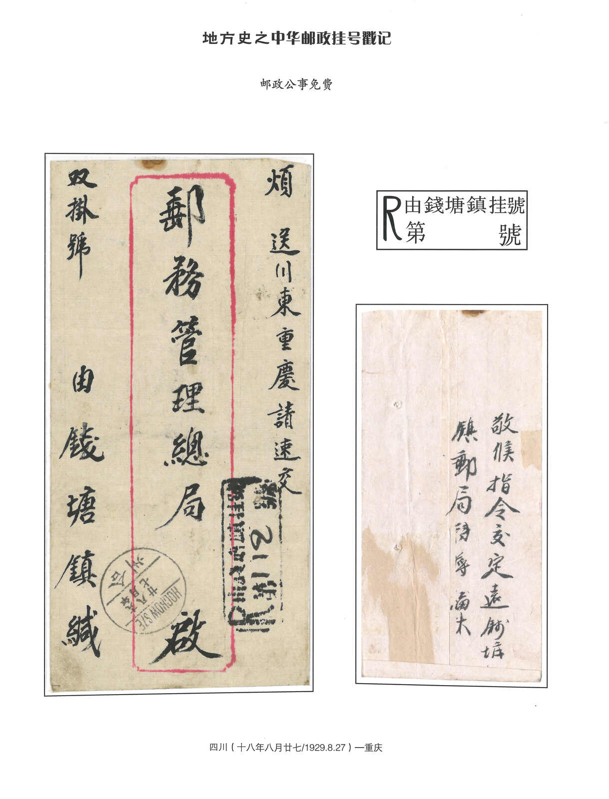 1929.8 錢塘鎮寄重慶。郵政公事封,無貼票,鈐“由錢塘鎮掛號”橫戳。8.27經合州。小地名郵例。(Image 1) (Image 2) (Image 3)