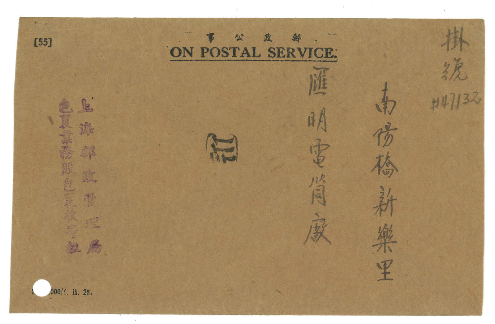 323 image1940 (11 Jan) On Postal Service cover from Shanghai Post Office, frankless and applied with Shanghai cds.