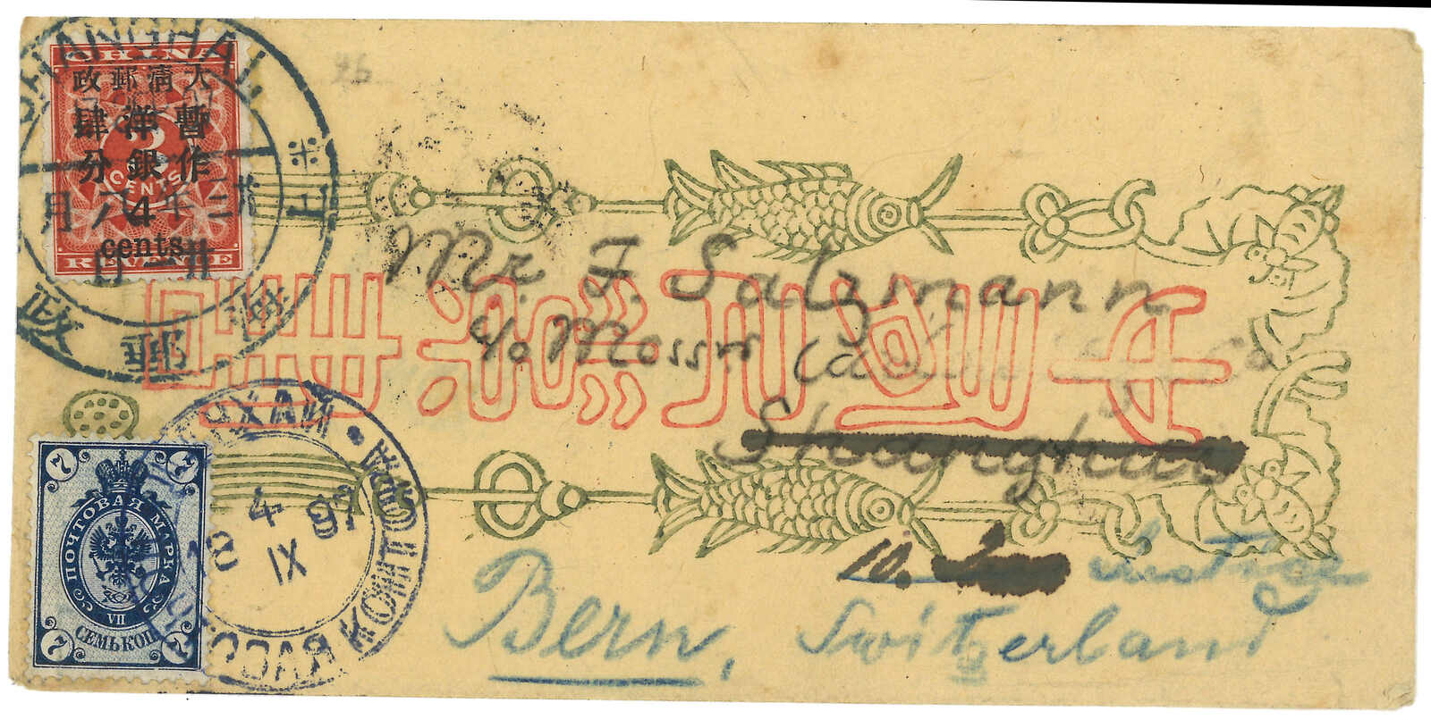 119 image1897 Shanghai (17 Sep) to Mr. F Salzmann, Switzerland, f.w. Red Revenue surch large figre 4c/3c (Chan 89) for double printed matter rate, tied by Shanghai dollar cds. In combination with Coat of Arms 7k, tied by Shanghai Russian PO (4 Sep) with T&S type 1 cds in violet. Transit Shanghai BPO (18 Sep), Hong Kong (21 Sep). Arrived Bern (22 Oct). Despite philatelic given the addressee, single franking of Red Revenue 4c and combination with Russian stamps is very appealing. Combination with Russian stamps is the rarest combination for Red Revnue covers as there is only one example recorded in "The Revenue Surcharges China 1897" by Directorate General of Posts, ROC. 2024 (May-Jun) Interphila Auction, lot 806. With swissasia-philately certificate.