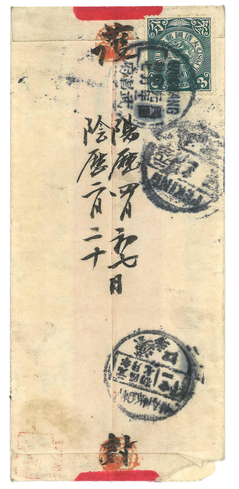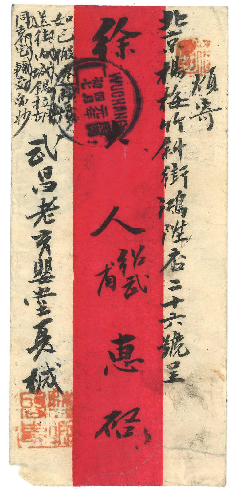1912.4.7 武昌寄北京。紅條封,背貼蟠龍3分,銷武昌府“民國元年”腰框英漢日戳。同日經漢口。4.11抵北京。嚴平西指湖北郵局使用帶有“民國′二字的日戳,目的可能有二,一為與1909年宣統元年有所區別,二是強調擁護共和的立場。(Image 1) (Image 2)