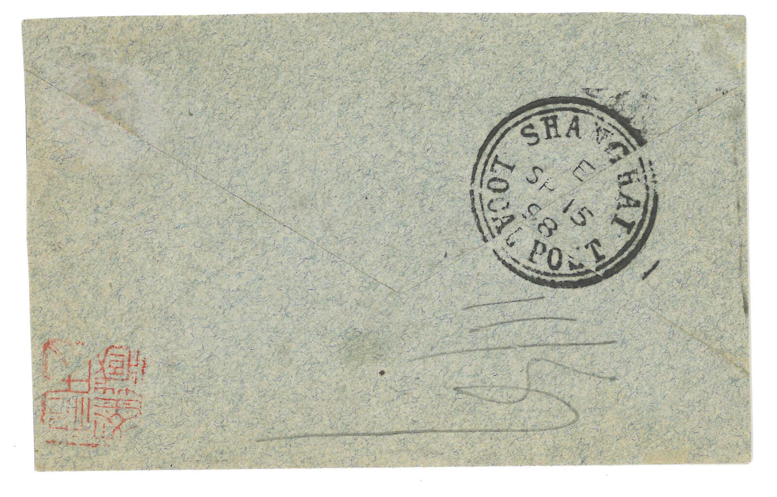120 cover image1898 Wuhu (13 Sep) to Shanghai, f.w. Red Revenue surch 1c with large box of central character (Chan 87a), tied by Wuhu Dollar cds in brown. Arrived Shanghai LPO (15 Sep).