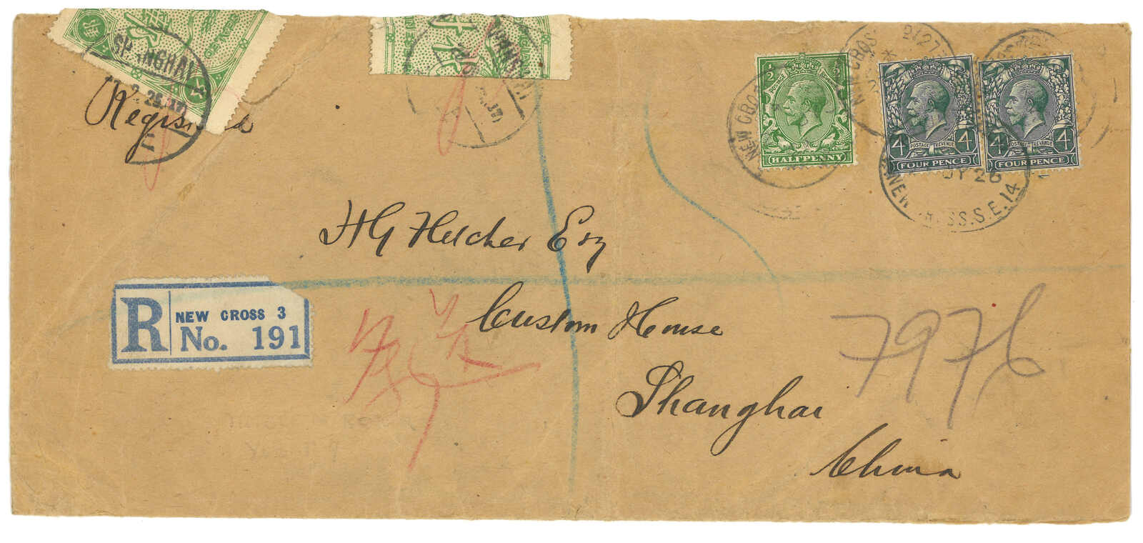 1935 (July 4) London to Shanghai "Return to Sender" and “P.T.O.” Cover Sent from South Kensington to Lt. Commdr. A. Yates at the Shanghai Club, redirected to the Admiralty, London. Features a GB 1½d Silver Jubilee stamp and a
