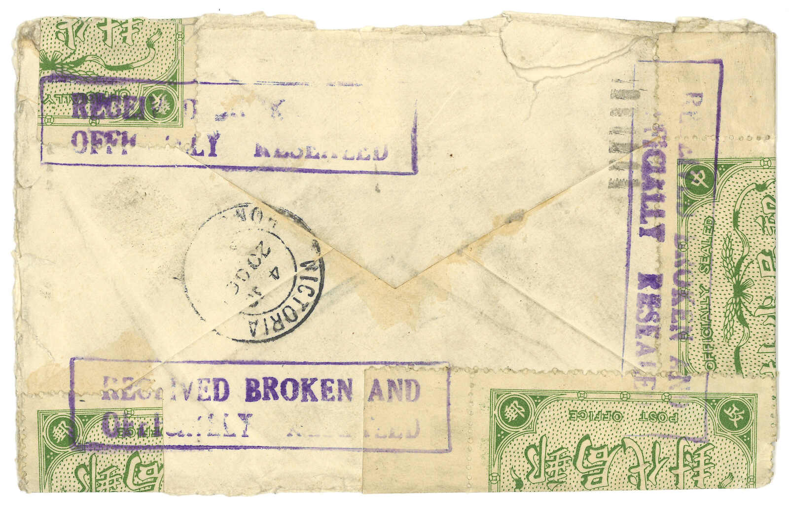 York Print $10 and Martyrs etc, tied by Kunming arrival cds (5 Dec) cds. Although some stamps were cut in half, franking of mulitple $20 stamps is still spectacular.