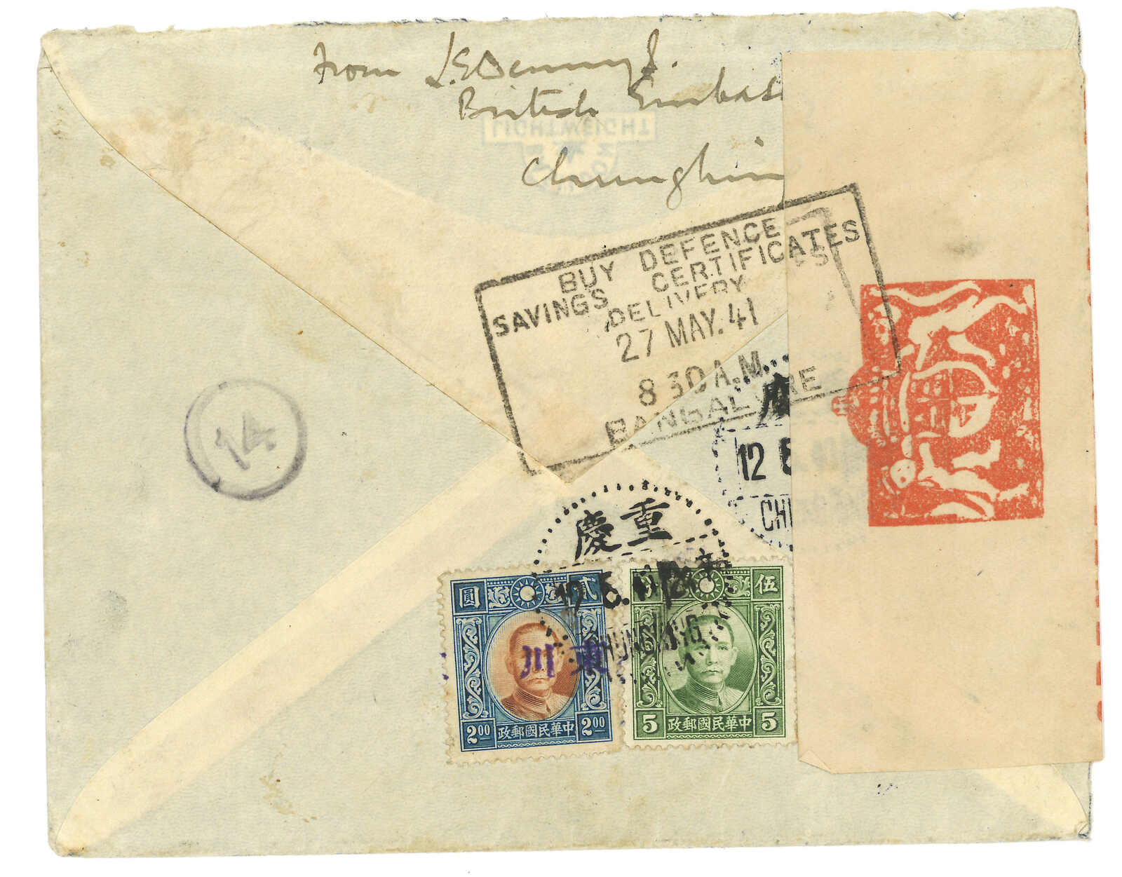 防匪加蓋“東川”2元,銷重慶三格漢英日戳。正寫有“Air Mail via Rangoon”。檢查並重封。5.27抵Bangalore,鈐宣傳日戳。貼用防匪地名票本已出色,仰光檢查圓戳同樣少見。(Image 1)