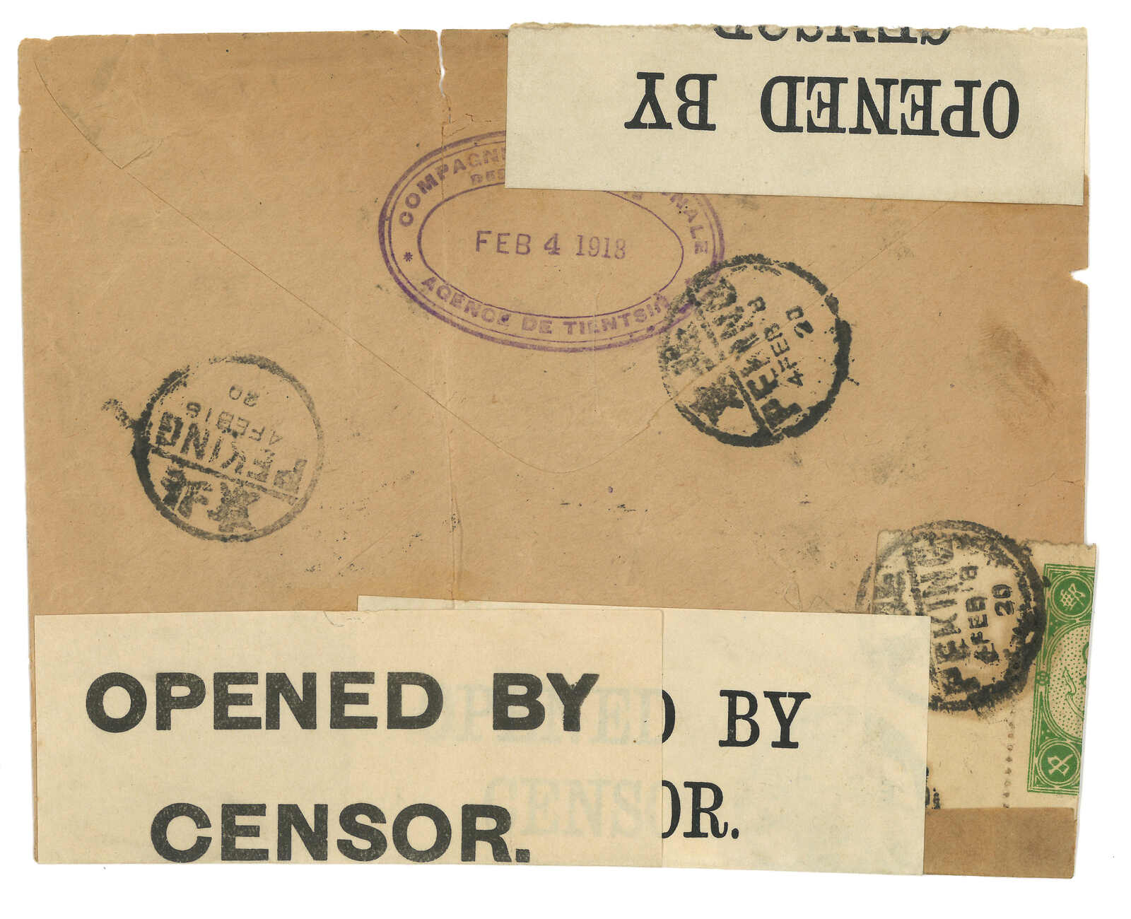 1918 Tientsin (4 Feb) to Peking, f.w. Junk 3c, tied by Tientisn bisected bilingual cds. Arrived Peking (4 Feb) and resealed with ROC 1st issue reseal label and English censor label. Very interesting example of using censor