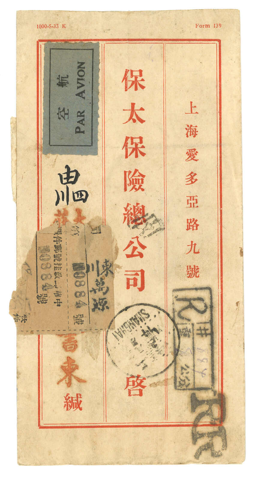 1933.8.19 萬源寄上海。航空掛號封,背貼烈士加蓋限四川貼用半分x4 + 8分x8 + 孫像5分,銷東川萬源日戳。正鈐掛號章及RR章。抵上海。(Image 1)
