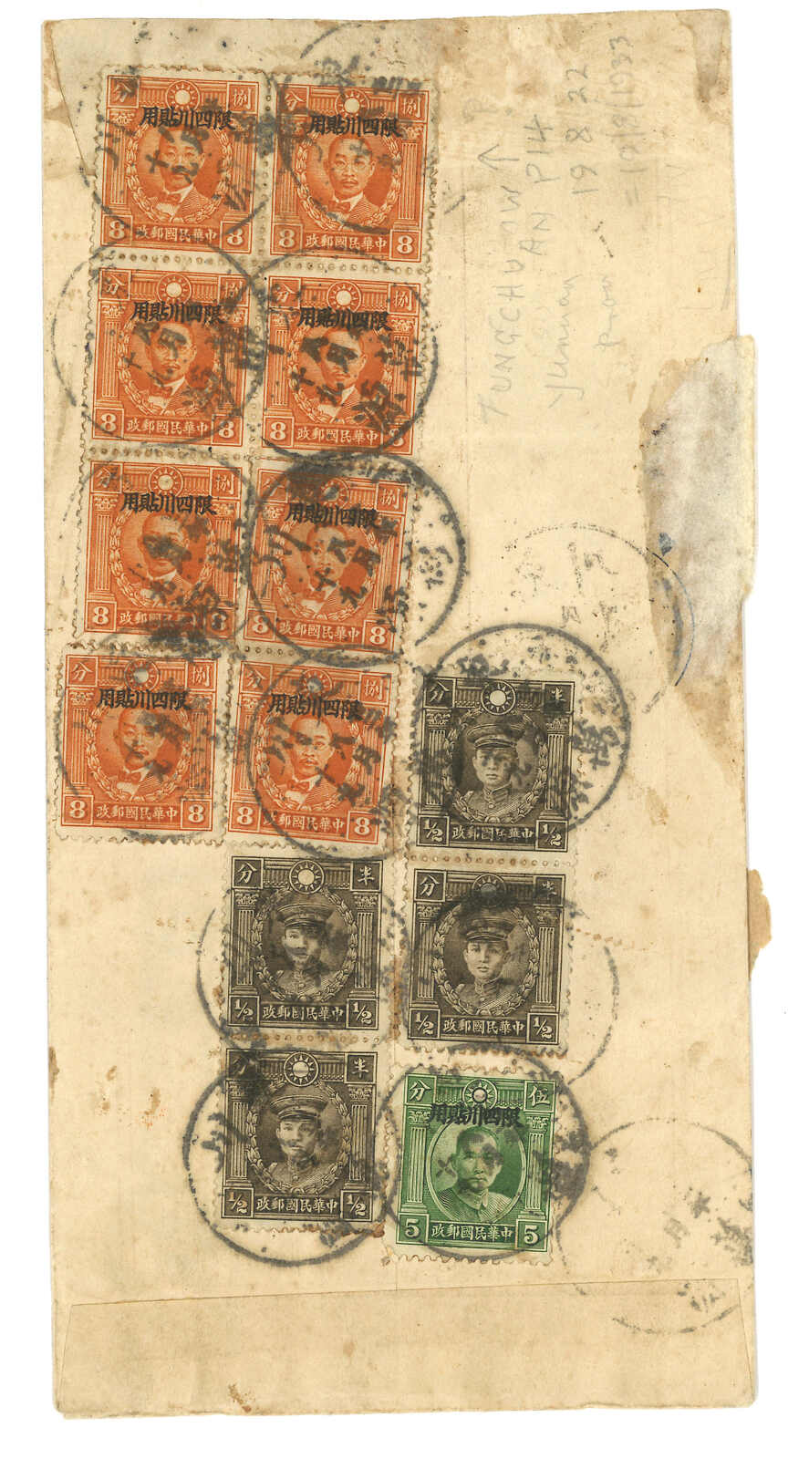 1933 Wanyuan (19 Aug) to Shanghai. Airmail registered cover, f.w. Martyrs ovpt. Limited For Use in Szechuan 1/2c x4 + 8c x 8 + SYS 5c on reverse, tied by East Szechuan Wanyuan cds. On front with registered mark, RR mark and