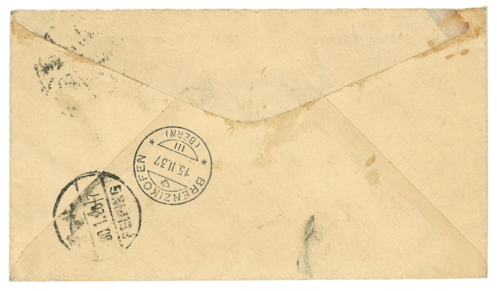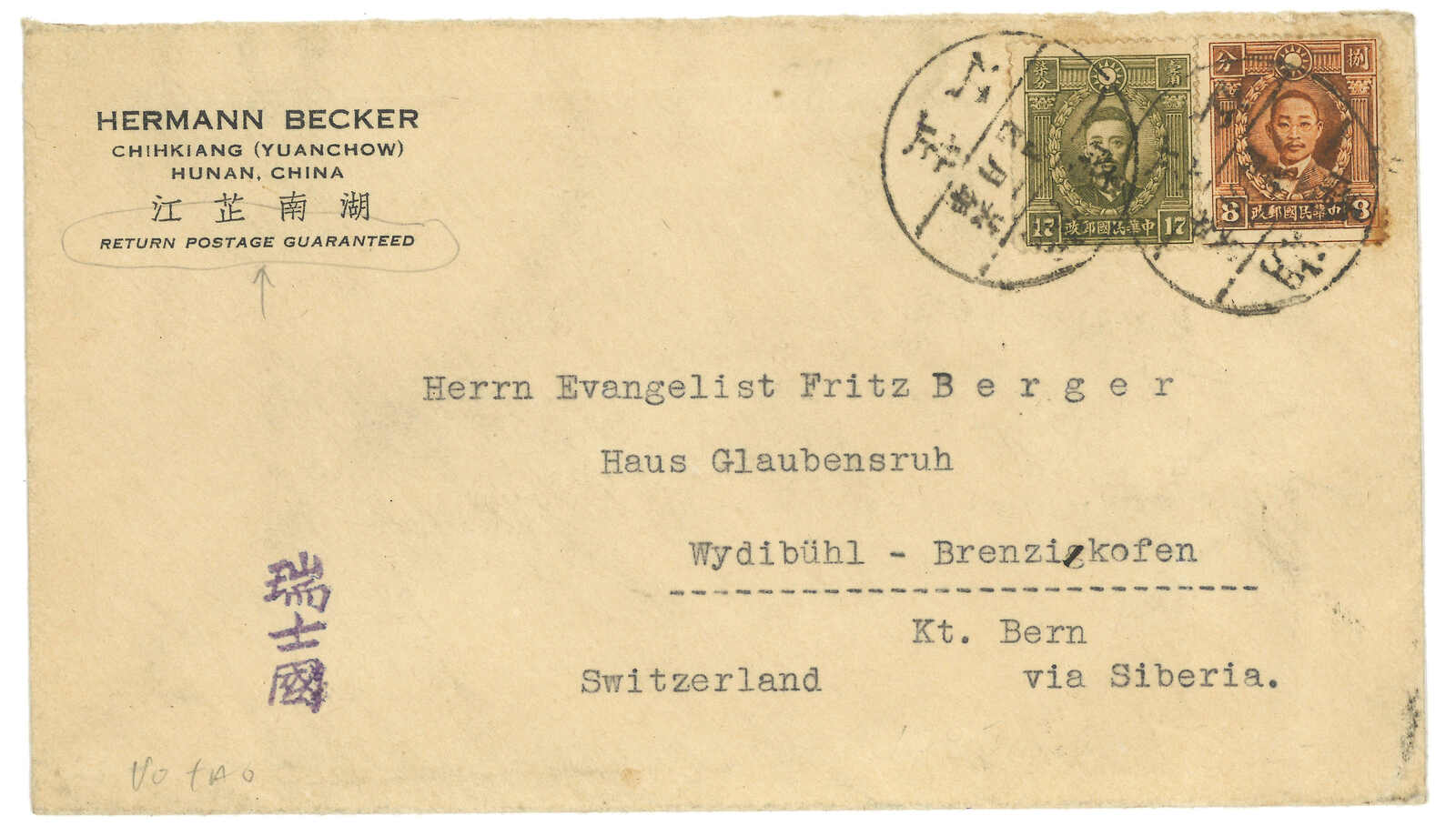 1937 Chikiang (30 Jan) to Switzerland, f.w. Martyrs 17c + 8c, in total of 25c international rate, tied by Hunan Chikiang cds. Transit Peking (30 Jan). Arrived Bern (15 Feb).