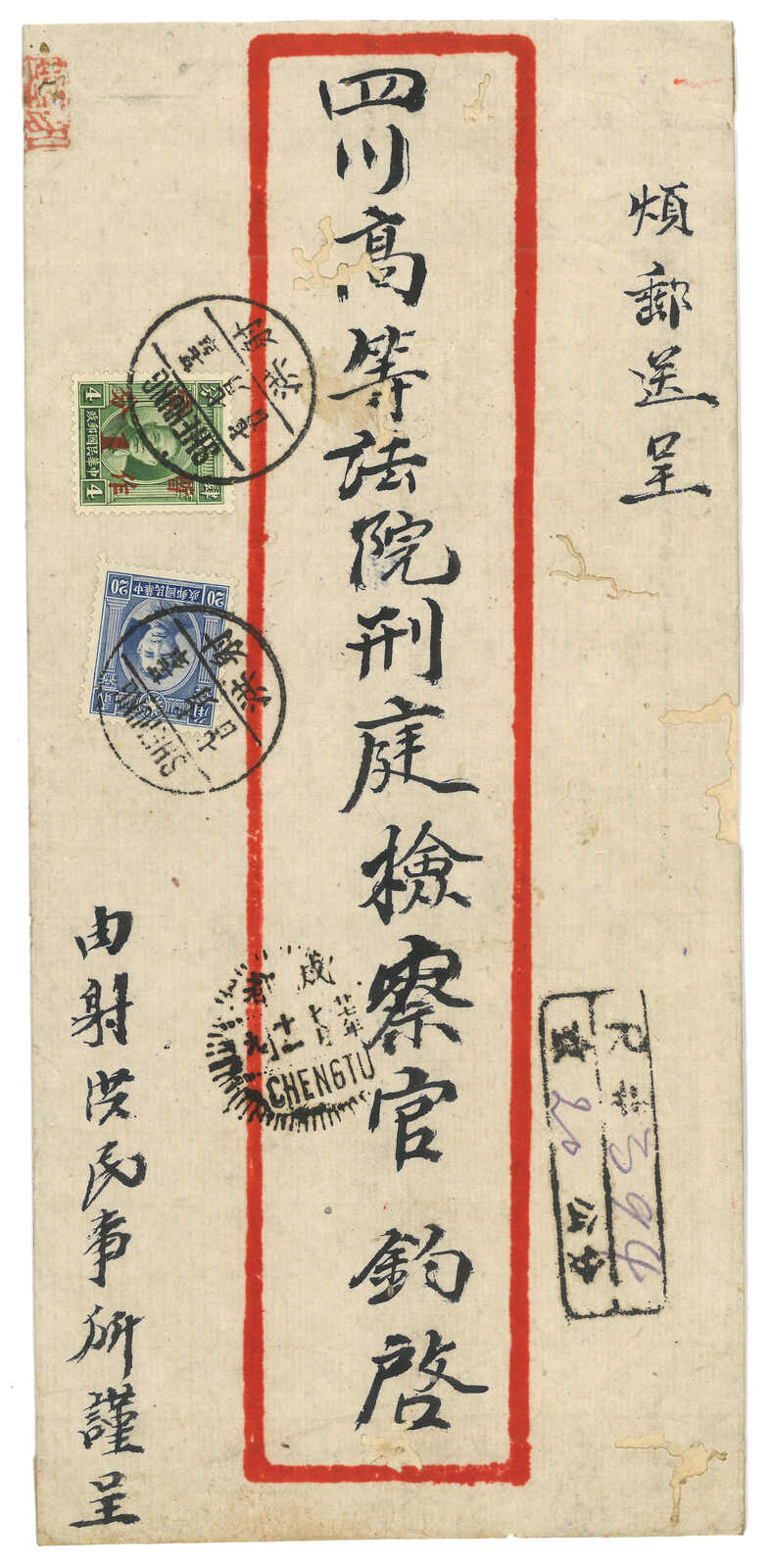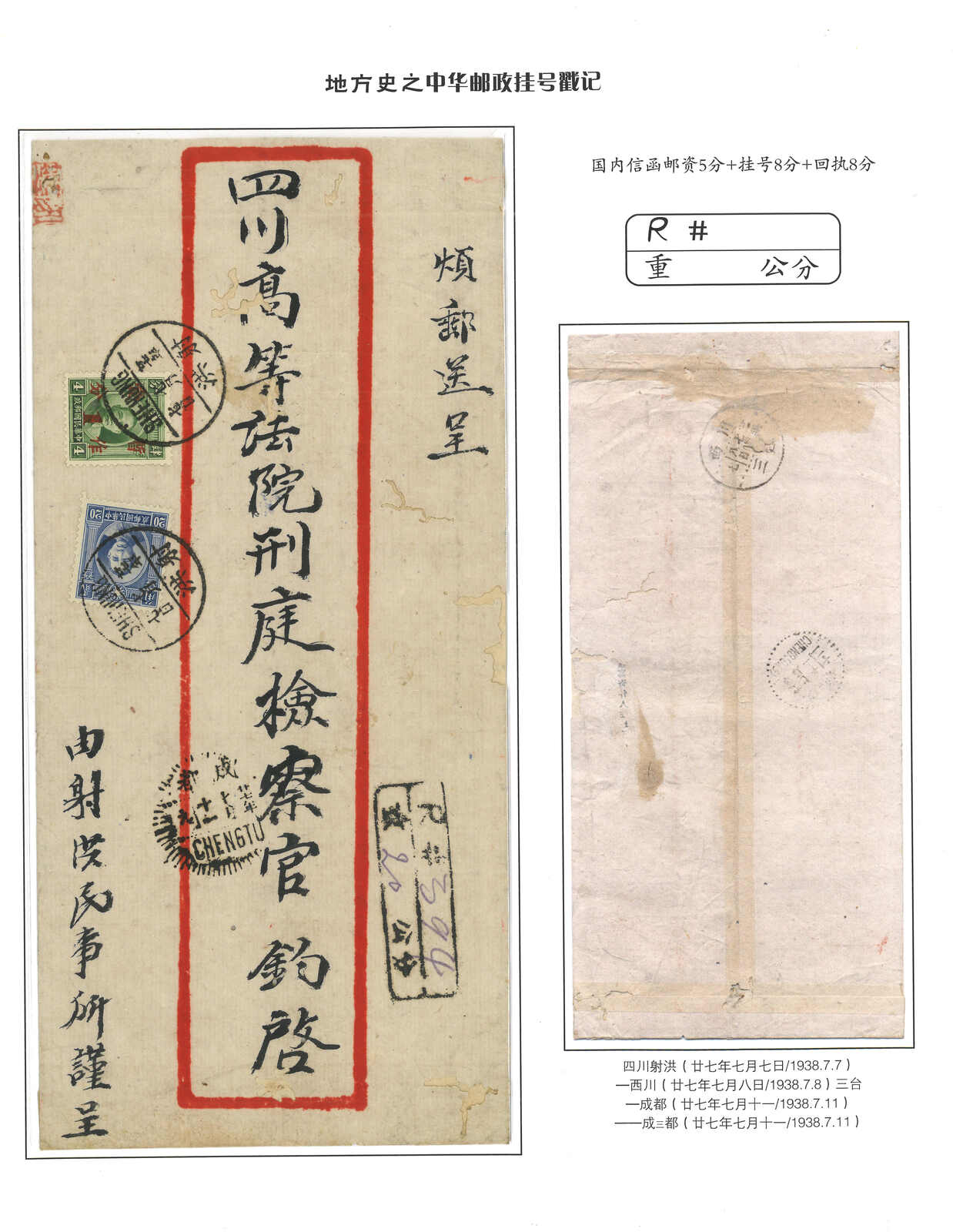 1938 Shehung (7 Jul) to Chengtu. Double registered cover, f.w. SUS 20c + surch 1c/4c, tied by Shehung bilingual cds., alongside with R mark with handfilled number and weight. Arrived Chengtu (11 Jul).