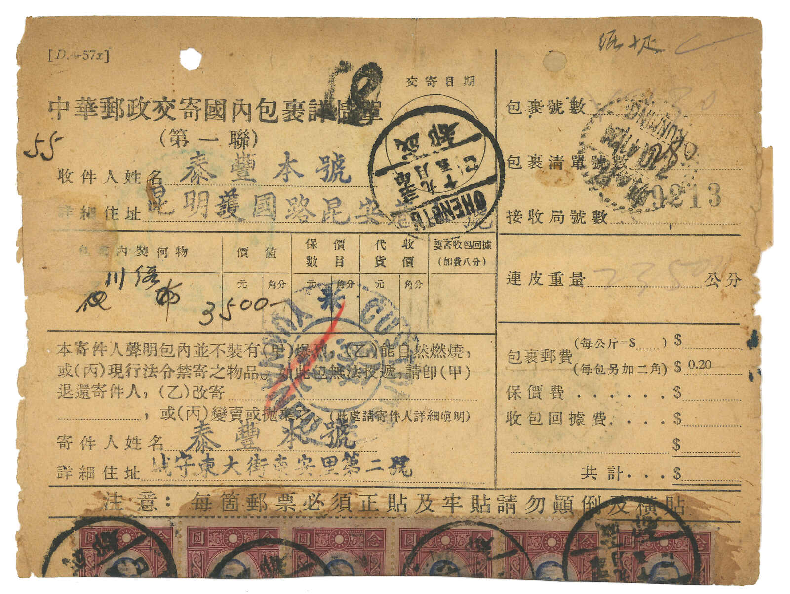 1941.9.15 中華郵政包裹單,自成都寄昆明,鈐成都始發日戳。混貼中華版及大東版孫像20元連票2件(至少一枚票帶破圓變異) +
