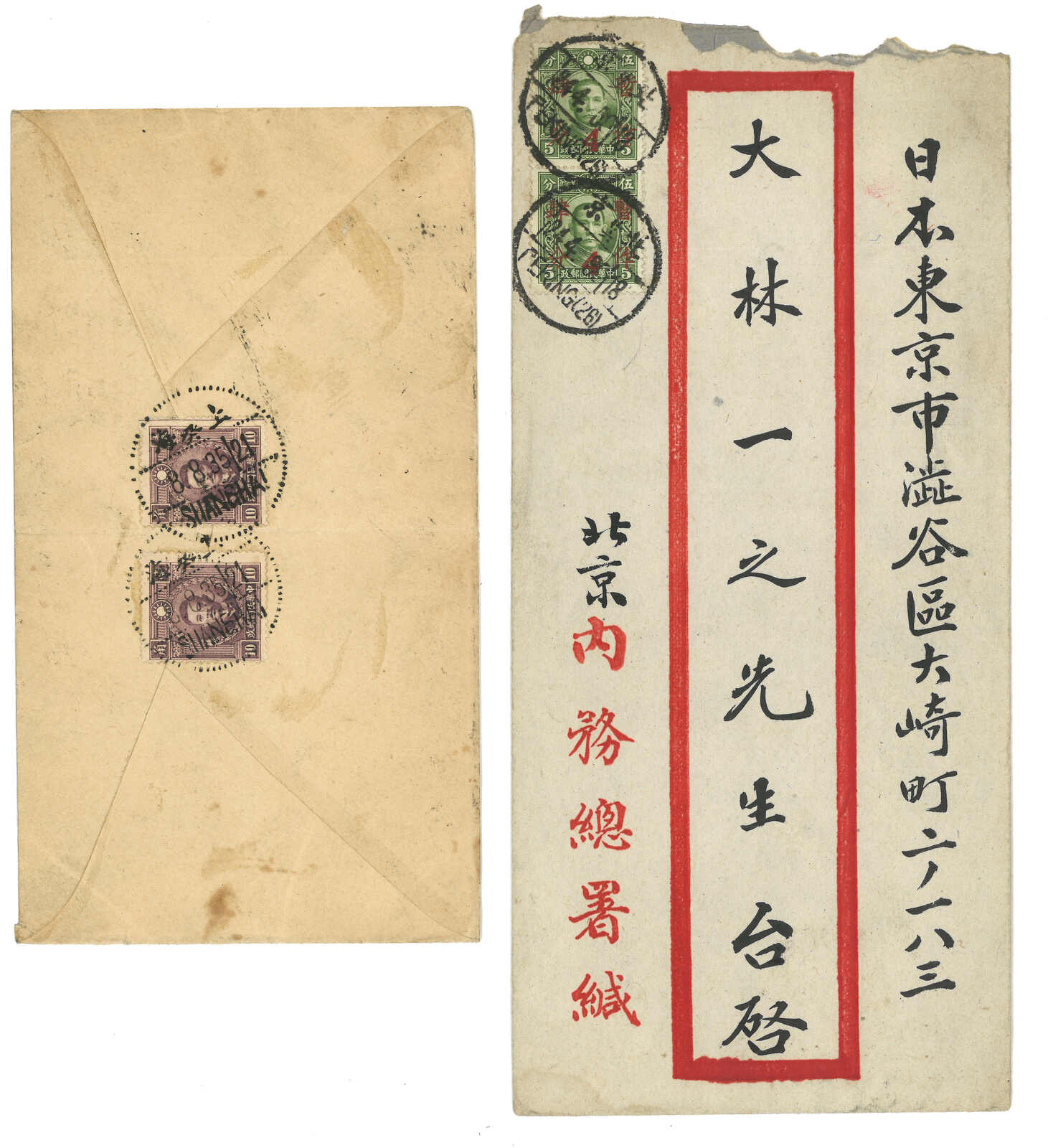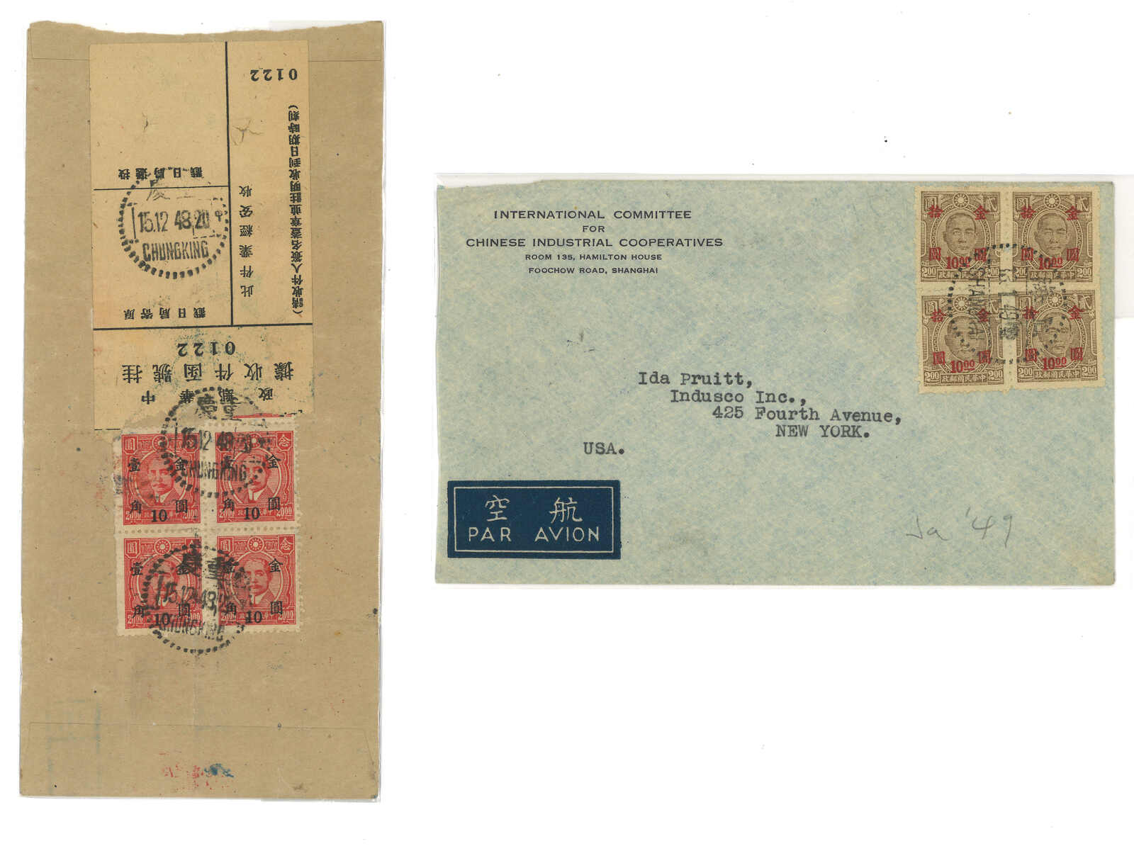 1940年代一組四件寄國外封,分別貼倫敦版、倫敦版改值國幣及重慶中華版改值金圓孫像票,銷長沙、青島、上海及鄞縣日戳。(Image 1)