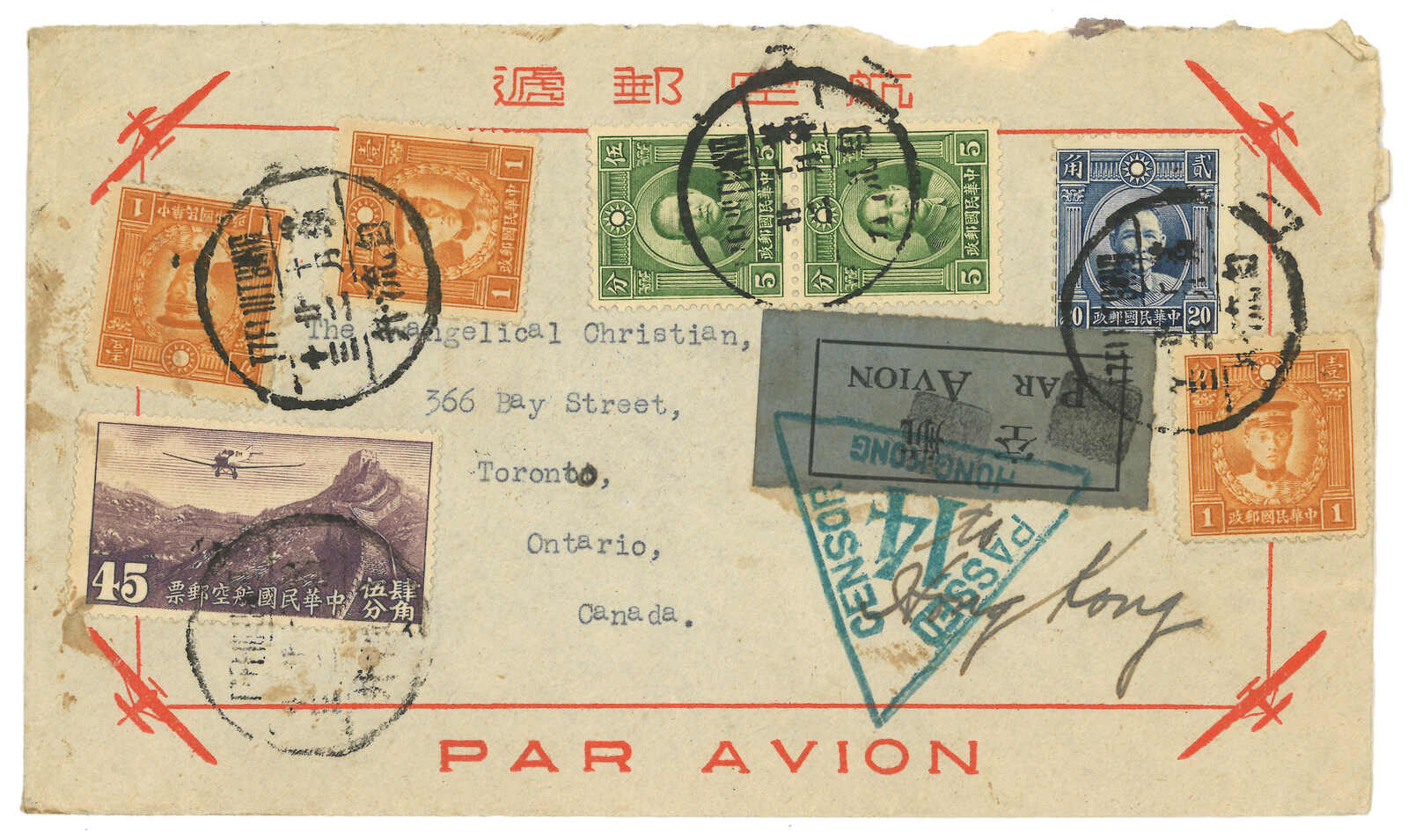 1940 Tzeliutsing (22 Oct) to Canada via Hong Kong. WWII censor airmail cover, f.w. SYS, Martyrs and airmail x7, tied by Tzeliutsing bilingual cds. Transit Chungking (25 Oct), Hong Kong (27 Oct) with type 3 no. 14 triangular
