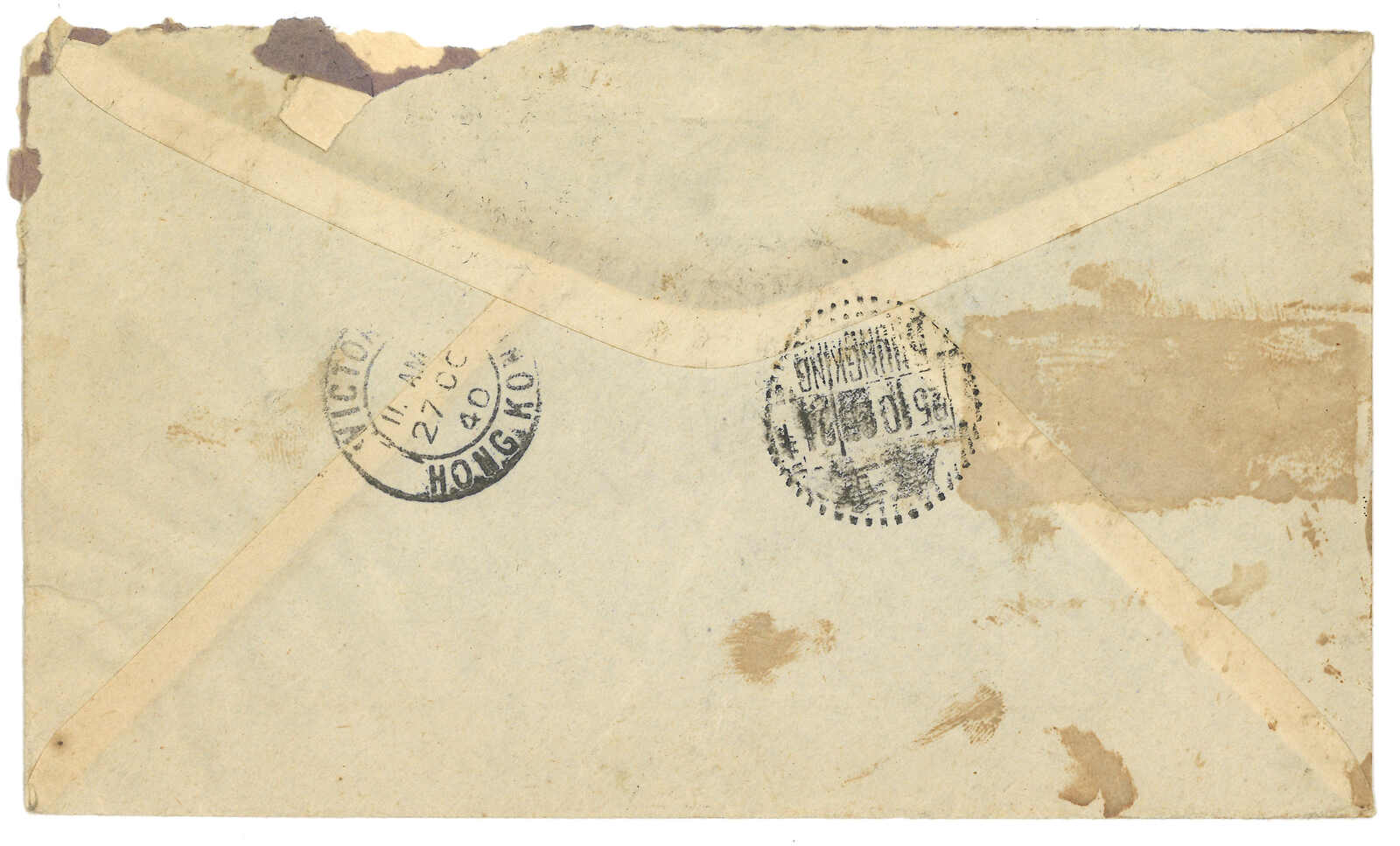 1940.10.22 自流井經香港寄加拿大。二戰檢查航空封,貼孫像、烈士及航空票共7枚,銷自流井三格英漢日戳。10.25經重慶,10.27經香港,鈐3型14號三角形檢查章。(Image 1)
