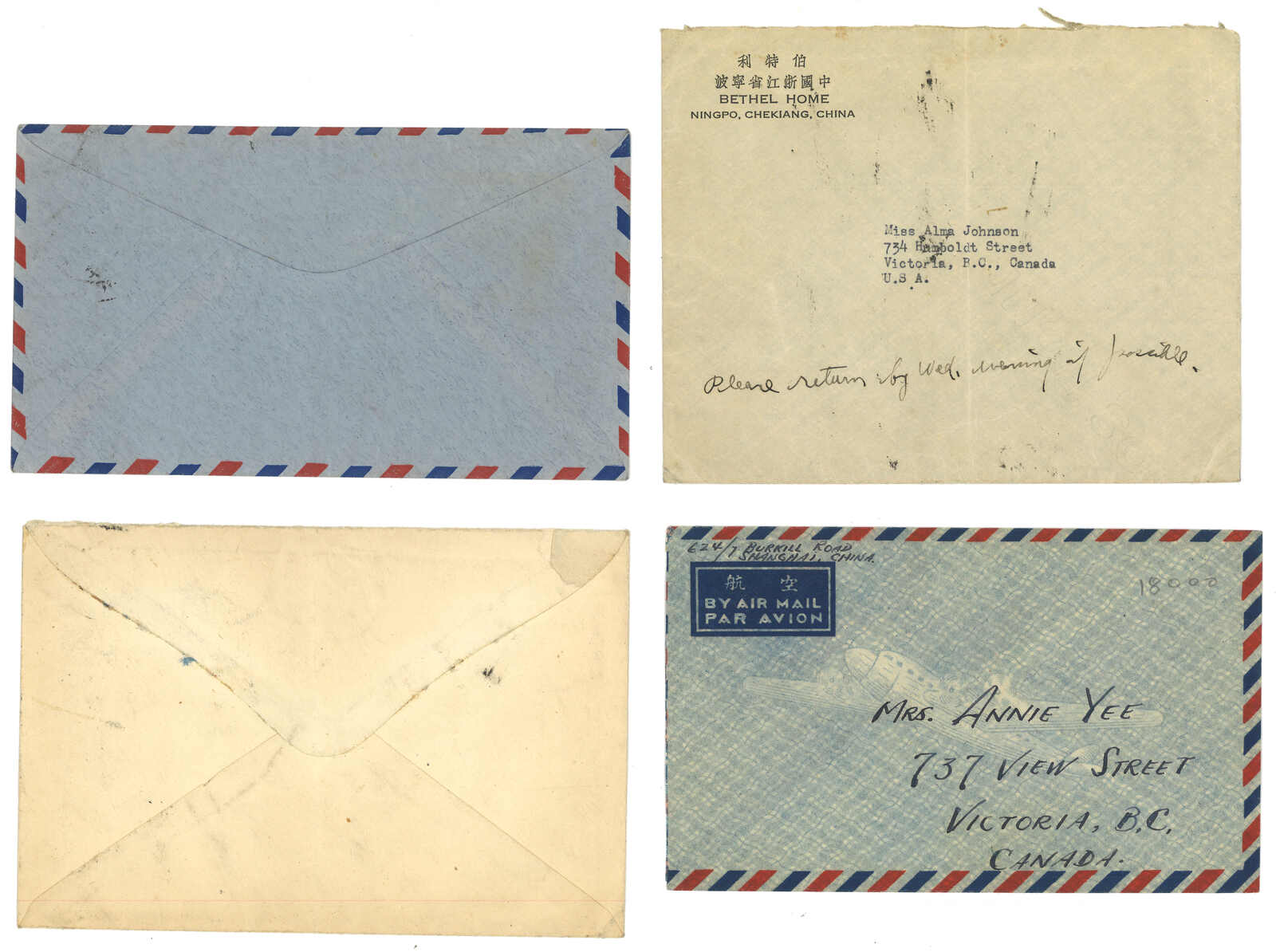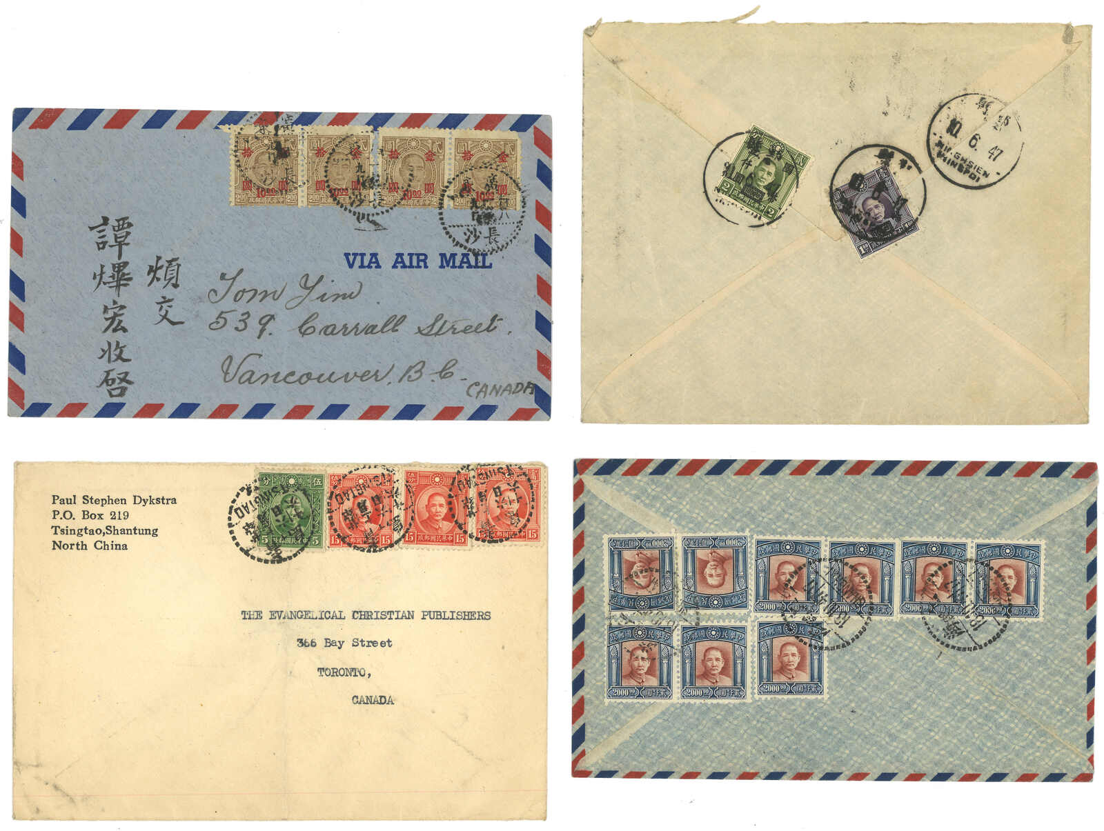 1940s a group of 4 outgoing covers, f.w. London print, London print surch CNC and CK Cunghwa Print surch Gold Yuan SYS issues respectively, tied by Changsha, Tsingtau, Shanghai and Ninghsien cds.