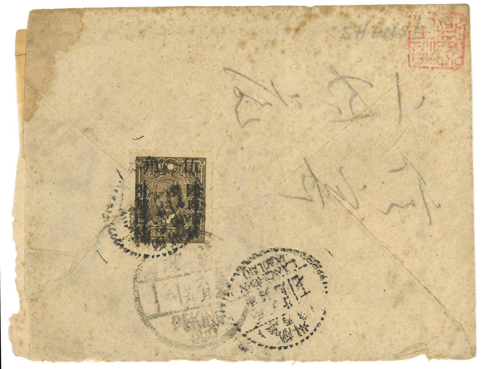 ca 1942 Lanchow to Peking, f.w. Shensi barred surch 50c on SYS 16c on reverse, tied by Lanchow bilingual cds. Arrived Peking (26 Jun). Peculiar usage of Shensi surch stamp in Kansu. Cover opened at right.