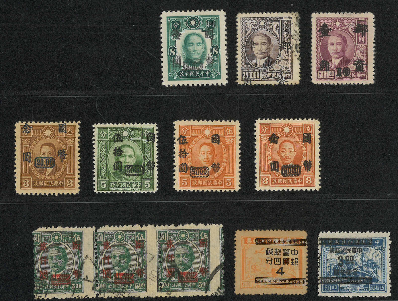 1948至1949年上海大東三版孫像4萬元及其改值金圓2萬元八方連新共3件,均帶右下直角廠銘,展示了不同版號。無貼。(Image 1)