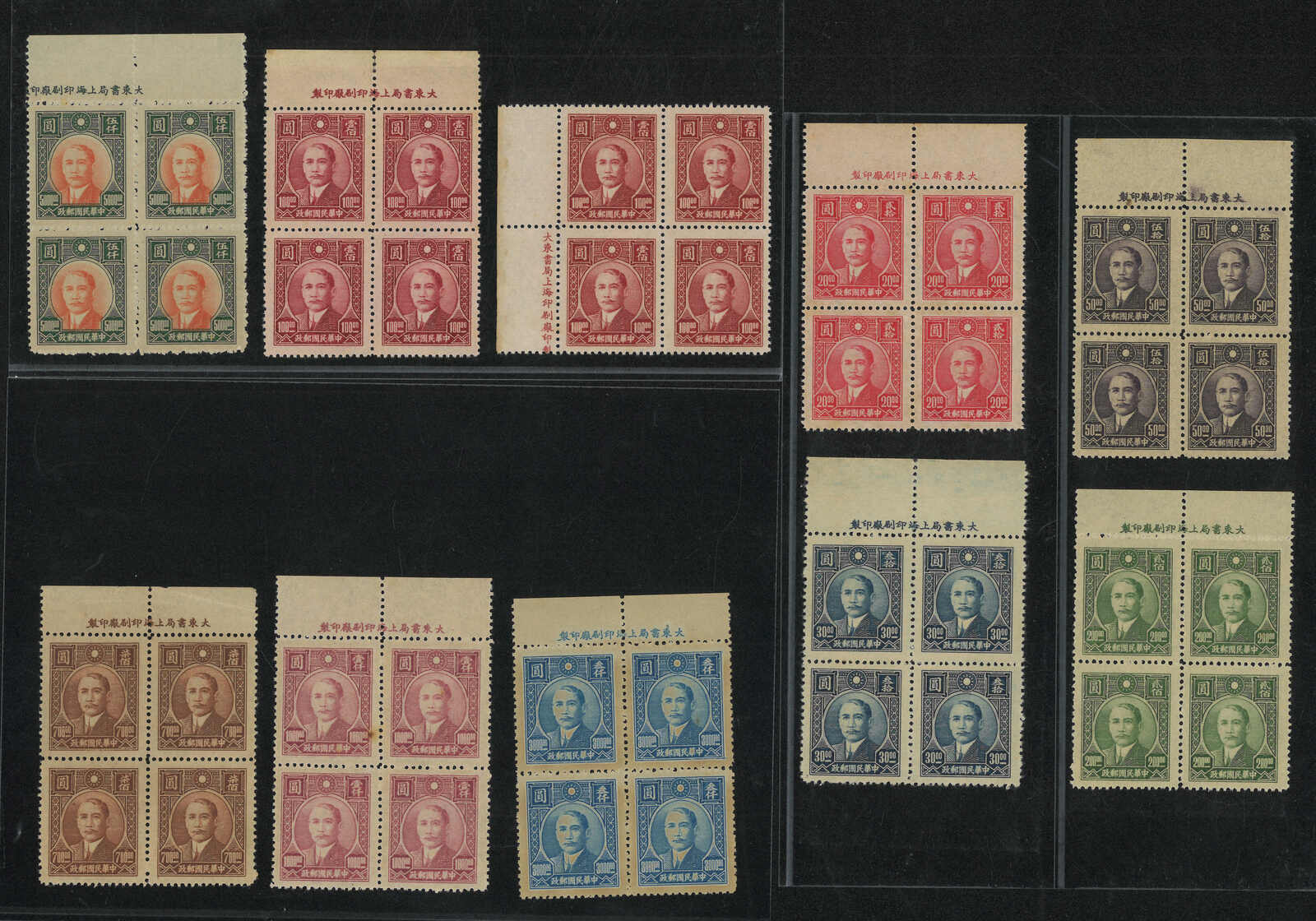 1946年上海大東一版孫像四方連一組10件新,均帶廠銘。欠70元及500元,但多出一件100元。無貼。(Image 1)