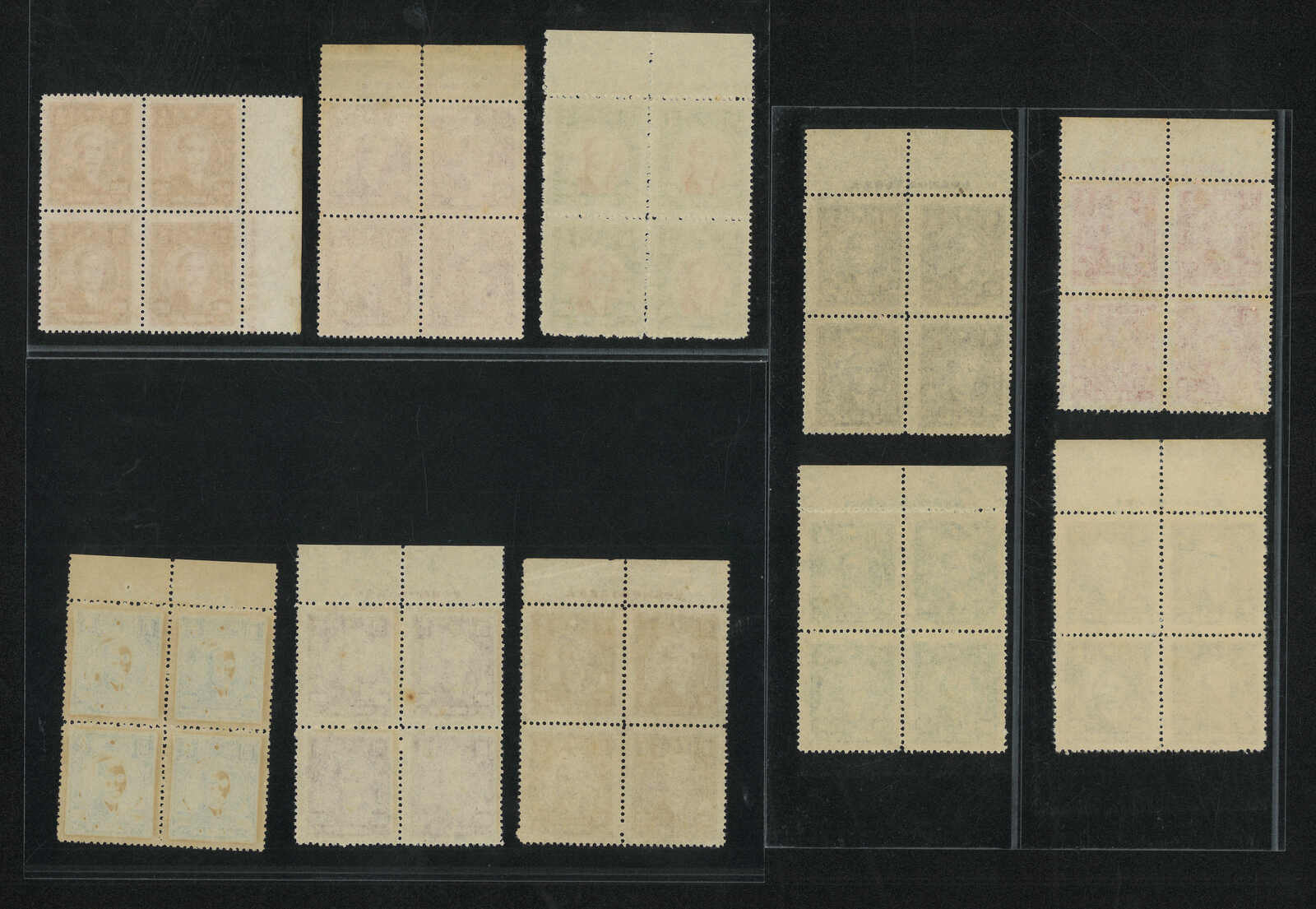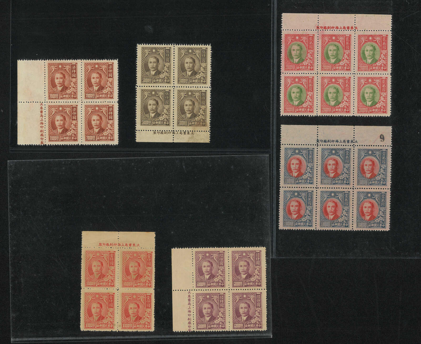 1948年上海大東三版孫像四方連一組9件新,均帶廠銘。欠2萬、30萬及50萬,否則齊全。無貼。(Image 1)
