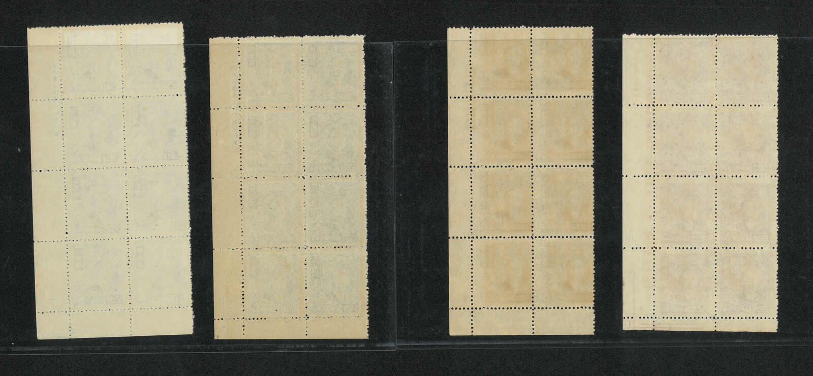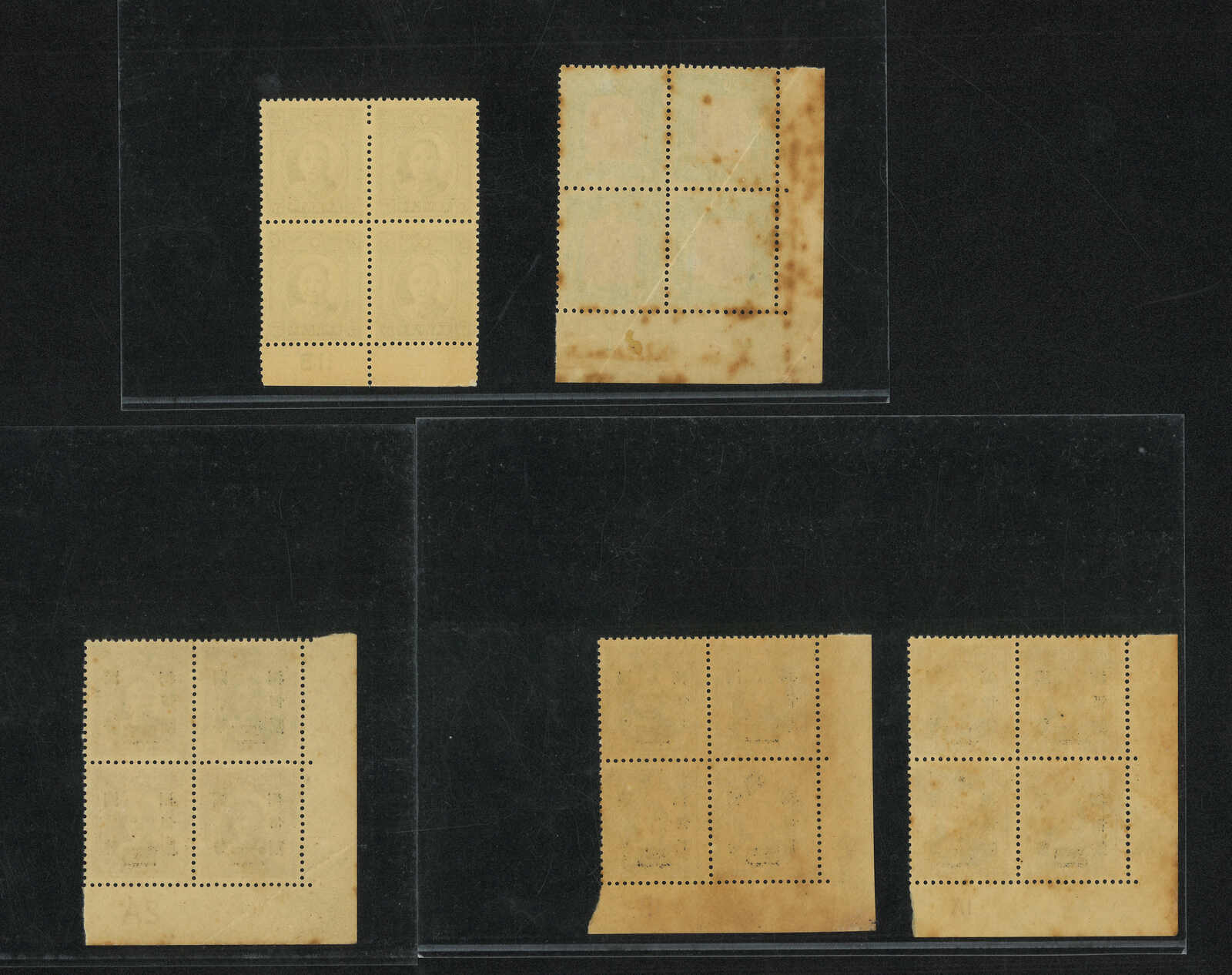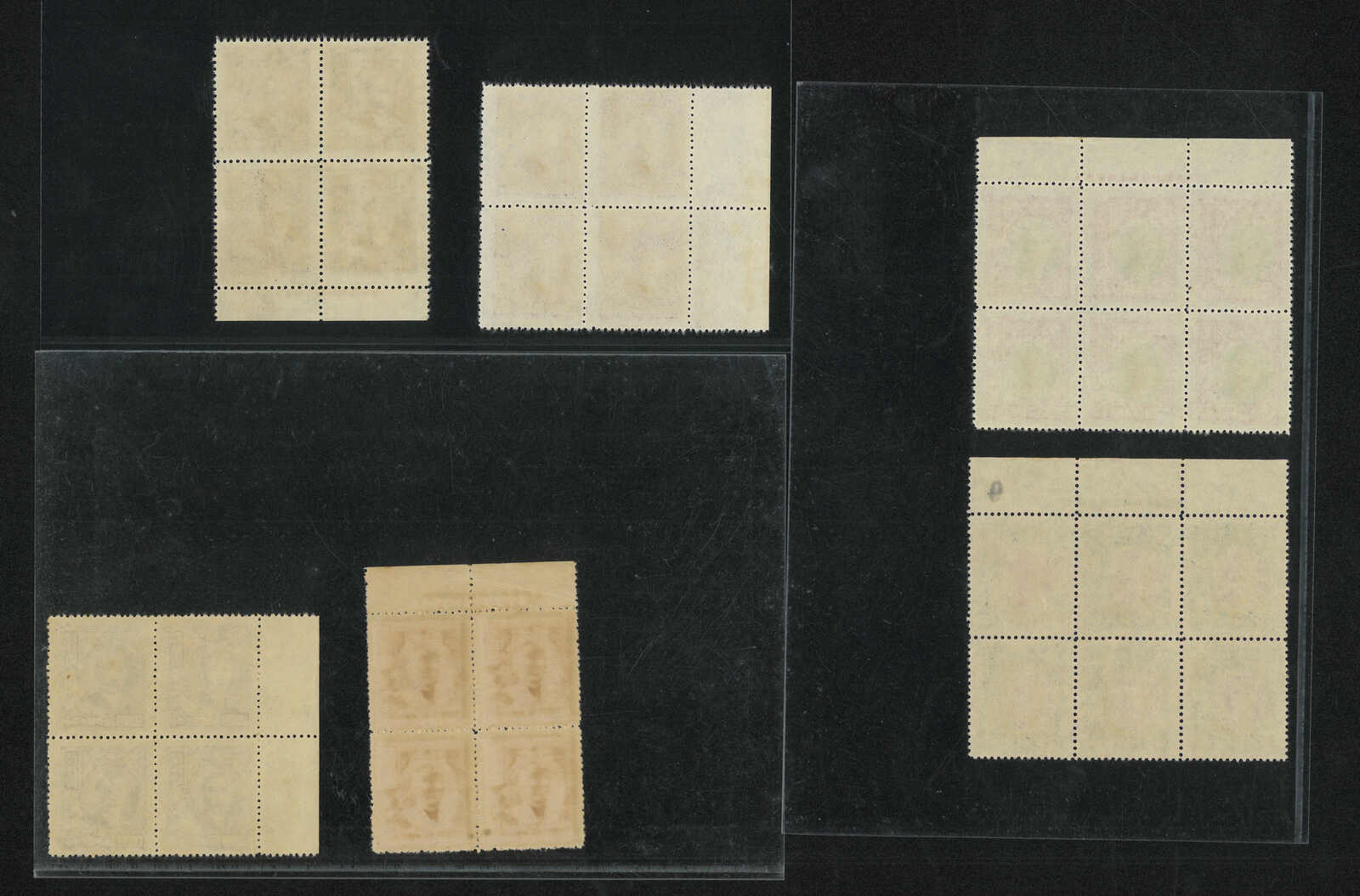 1940s London 3rd print SYS 5c, surch CNC $800/$30 and 4th print $1000 blocks of 4 in a group of 5, showcasing different plate numbers. MNH with toning.
