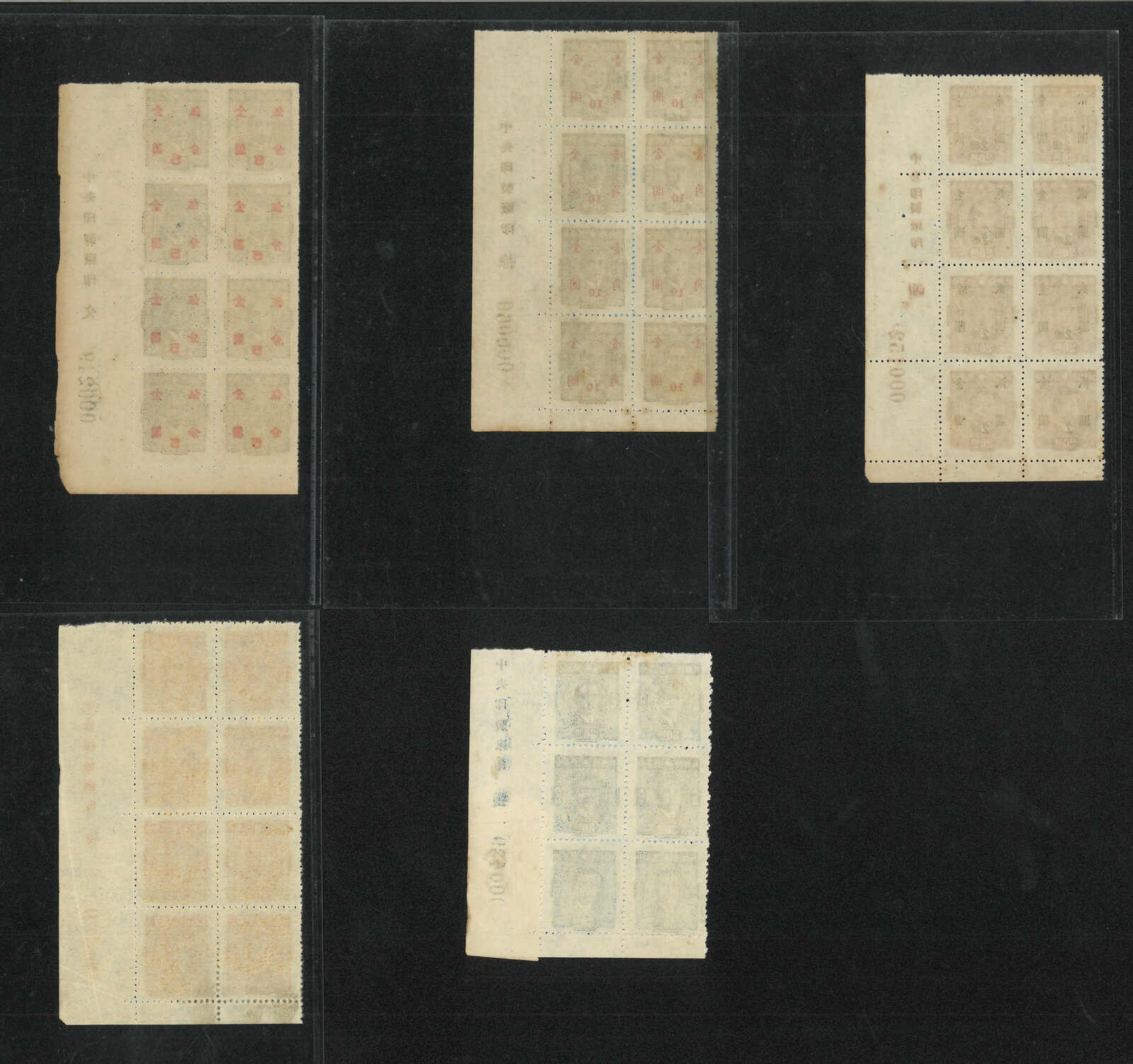 1948-1949 Shanghai Dah Tung 3rd Print SYS $40,000 and its surch Gold Yuan $20,000 in 3 blocks of 6, all with bottom right corner imprint margin. Showcasing different plate numbers. MNH.