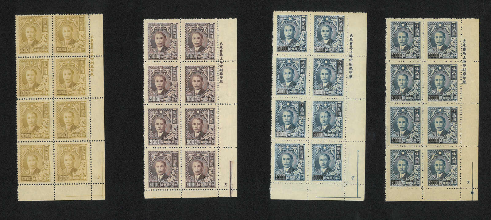 1948年上海大東三版孫像5萬、20萬及200萬八方連新共4件,均帶右下直角廠銘。無貼。(Image 1)