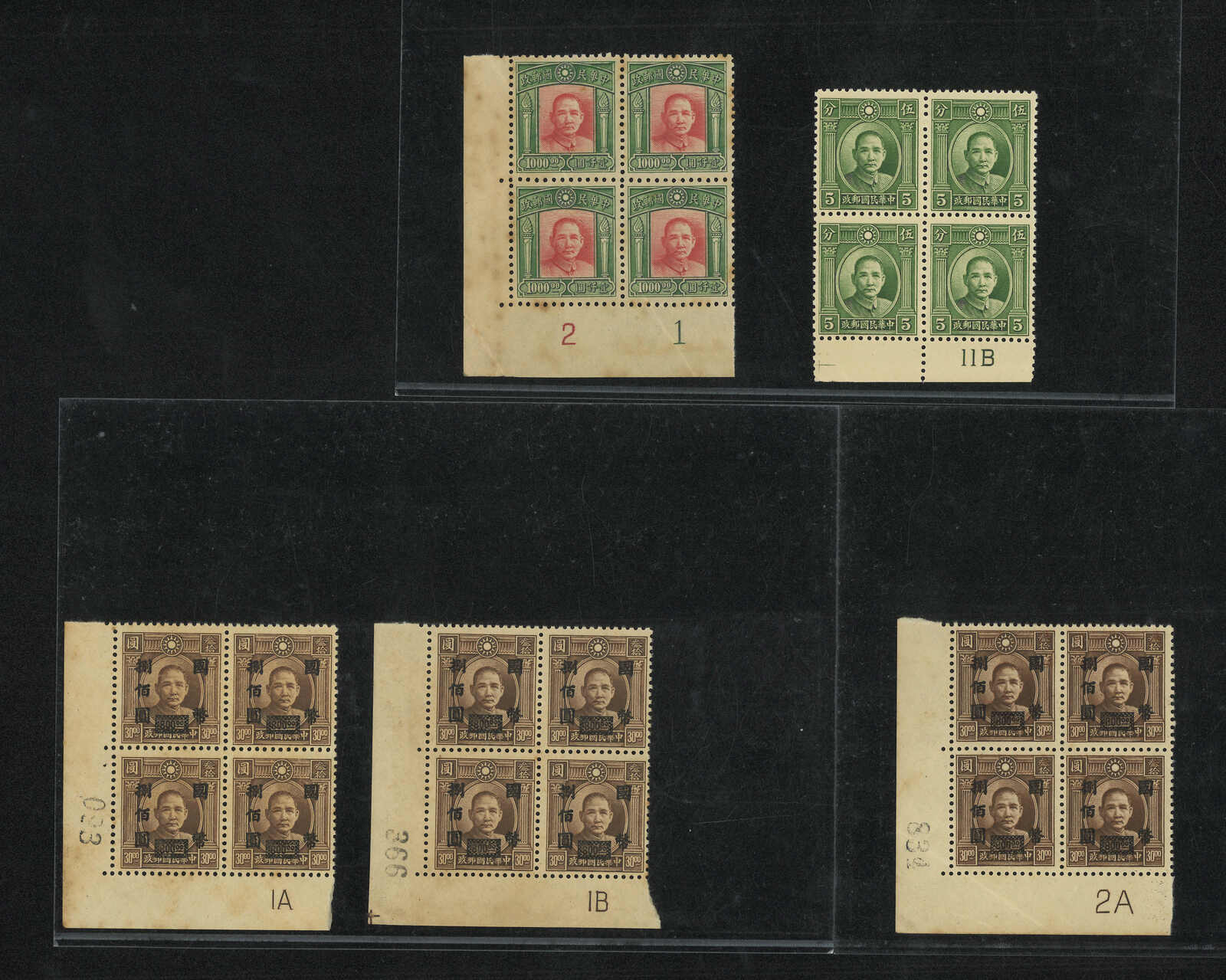 1940年代一組五枚帶加蓋移位變異之烈士改值國幣票。(Image 1)