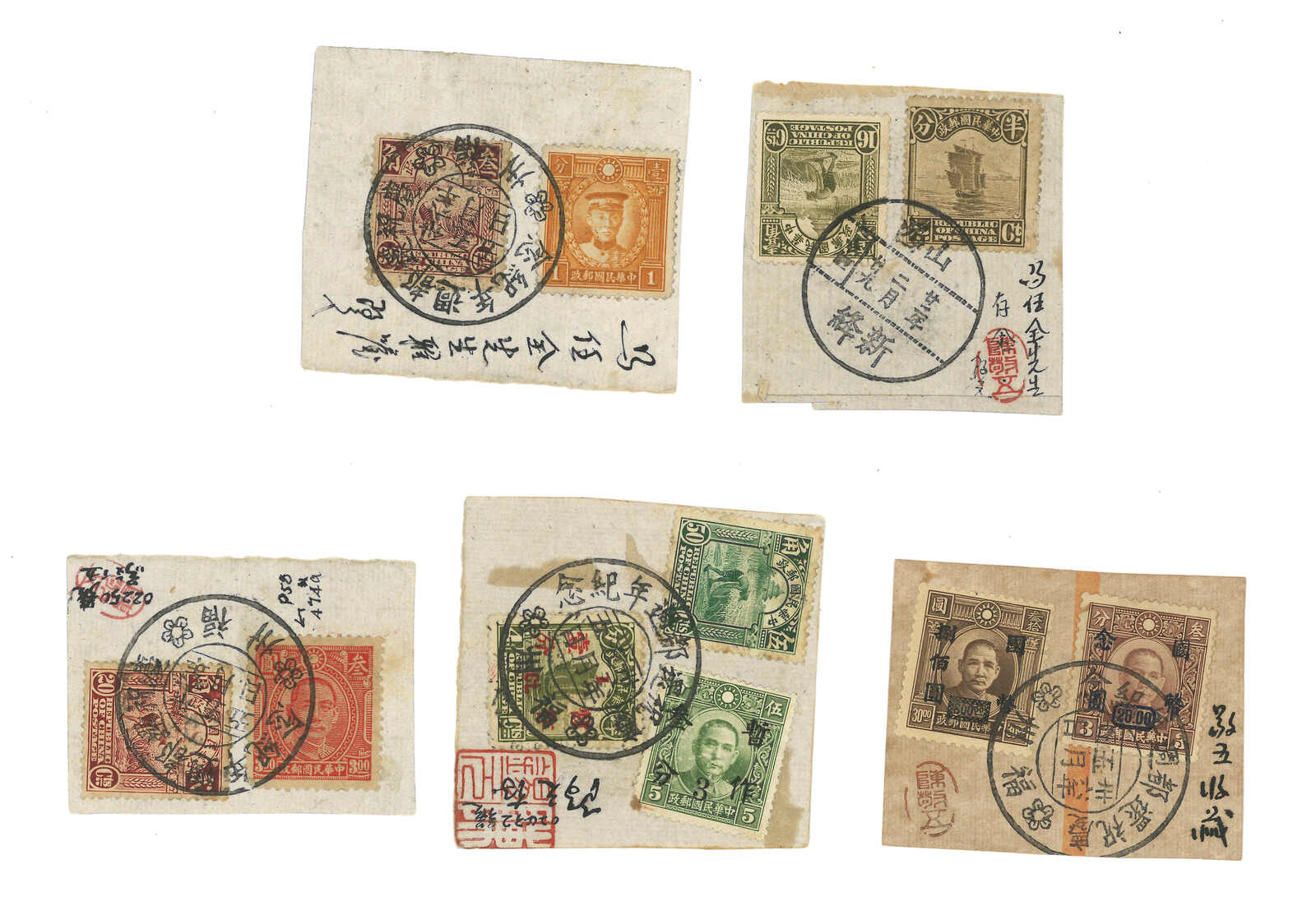 1947 (5 May) a group of 4 pieces applied with "Return of Government / Foochow" commemorative cds, plus a piece with the name of philatelist Ma Ren-Chuen.