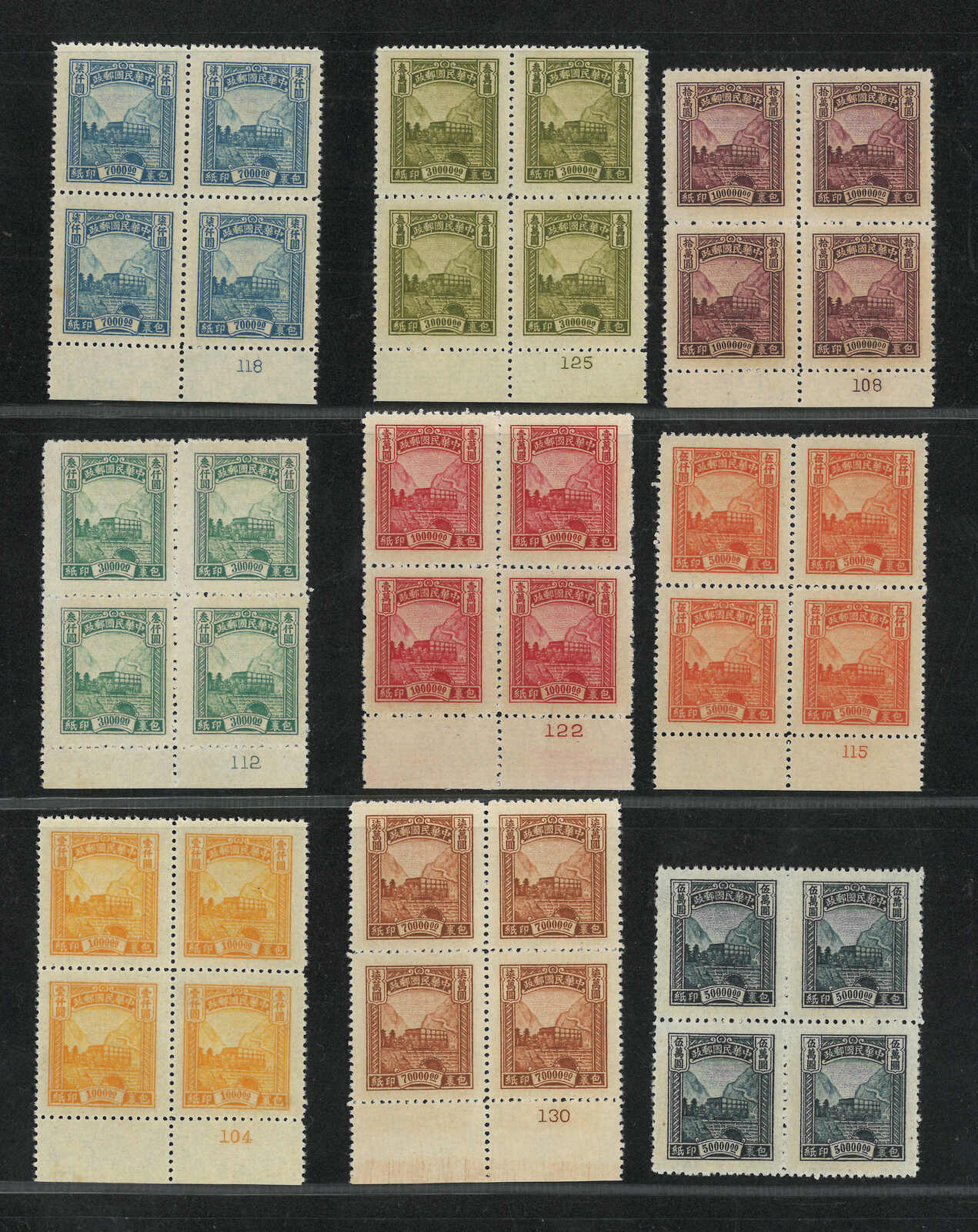 1948 Shanghai Dah Tung 3rd print SYS blocks of 4 in a group of 9, all with imprint margin. Missing $20,000, $300,000 and $500,000, otherwise complete. MNH.