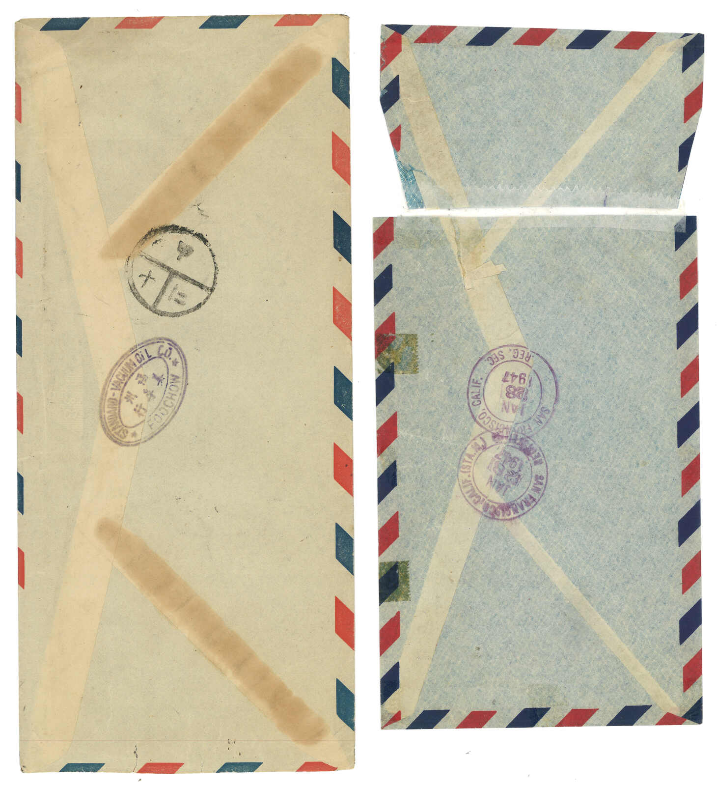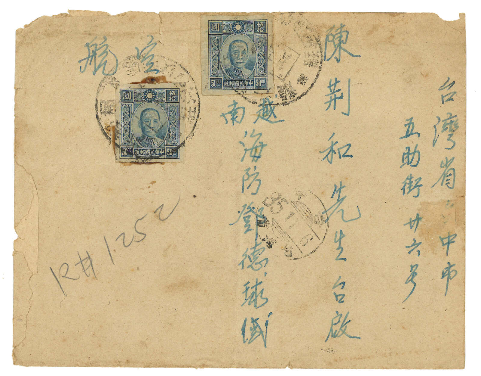 1946 (28 Oct) Haiphong to Taichung via Hanoi. Airmail cover, f.w. SYS 2x $50, tied by rare "Lungchow PO / via Hanoi dispatch office" cds. Arrived Taichung (6 Nov). This military PO was founded in Oct 1945 and dissolved at the