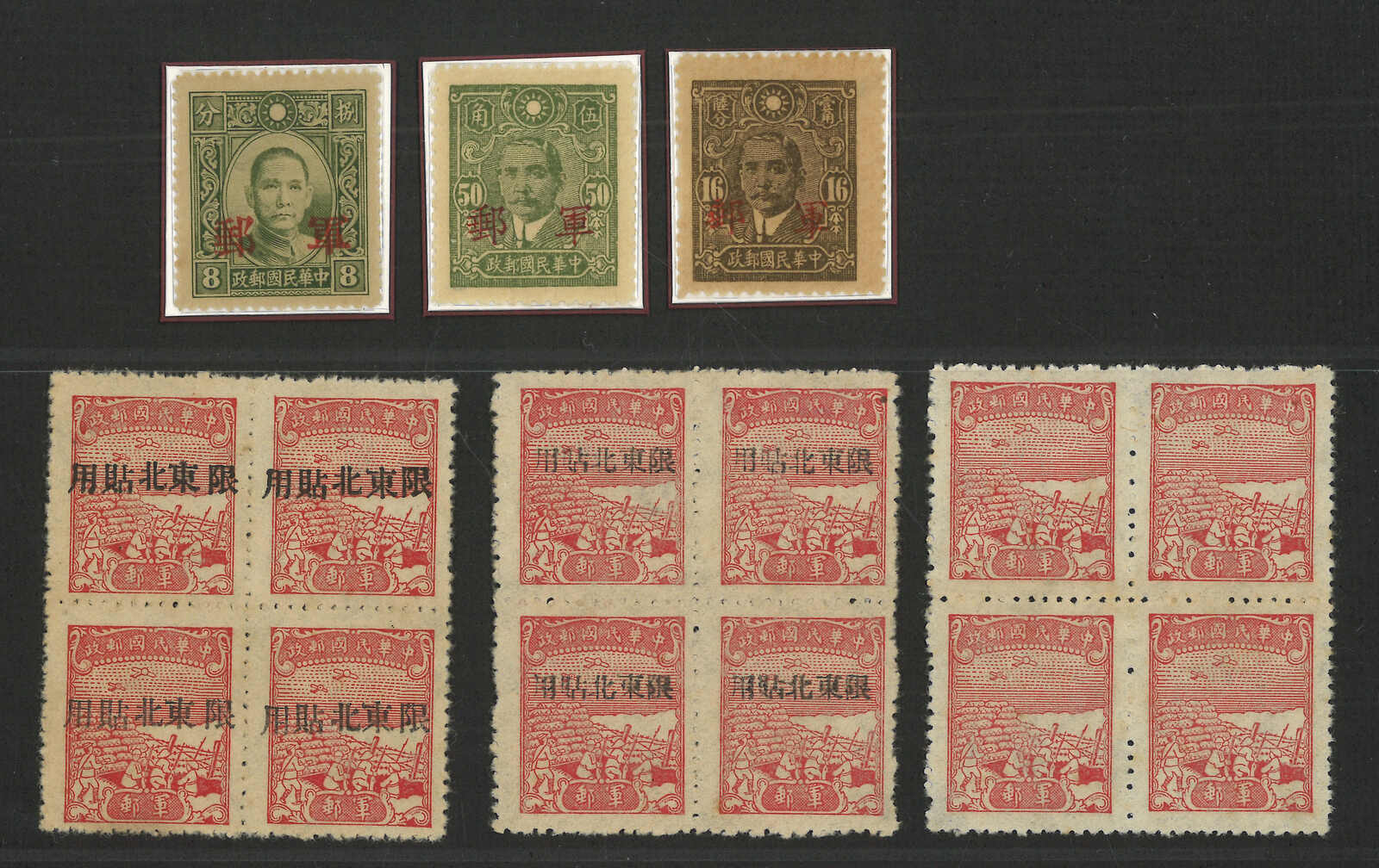 兩頁共16枚孫像加蓋軍郵票及中信版無面值軍郵票,展示了各地加蓋樣式,均為新。(Image 1)