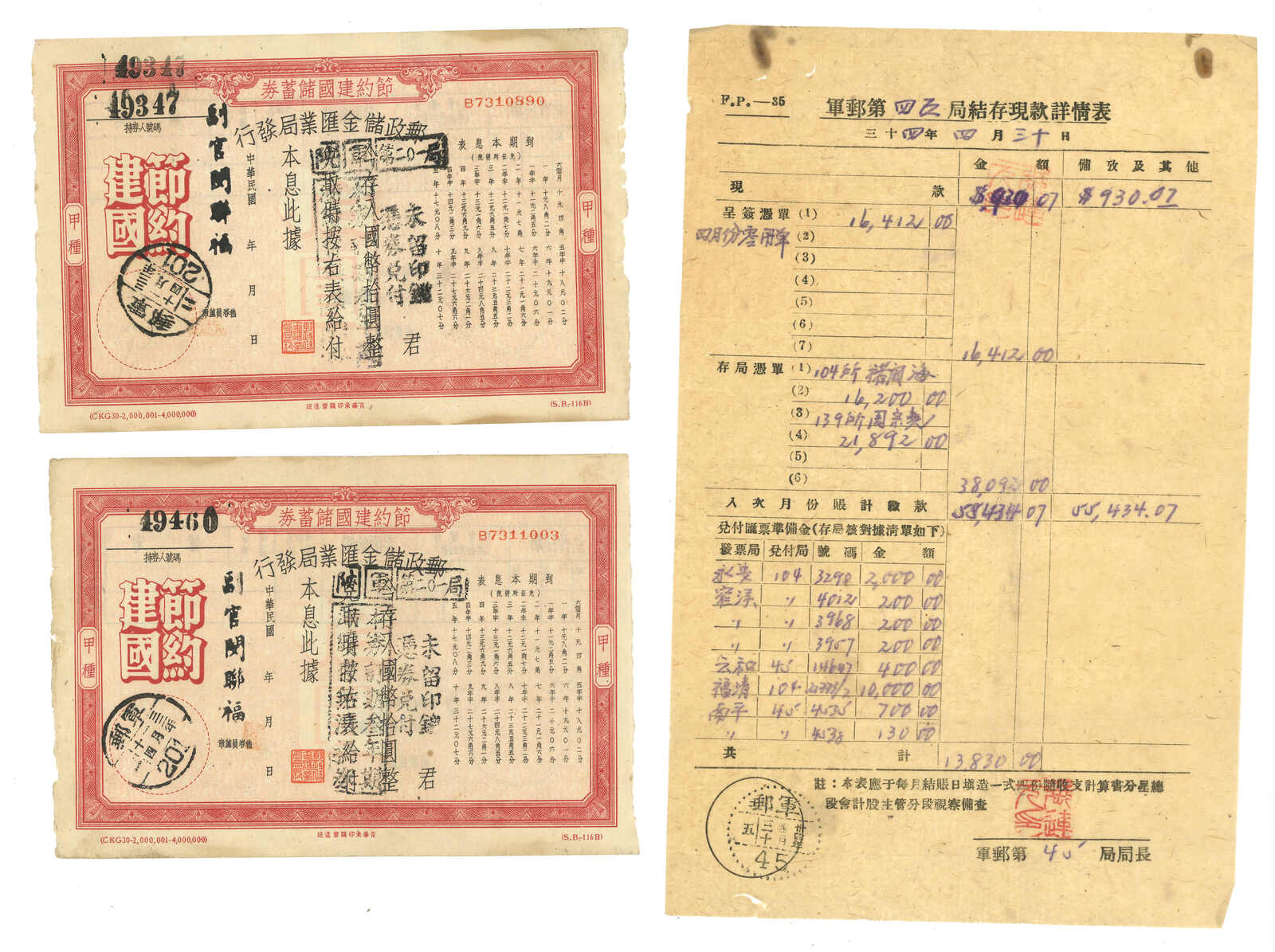 一組民國軍郵票、節建建國儲蓄券及軍郵局存款詳情表。(Image 1)