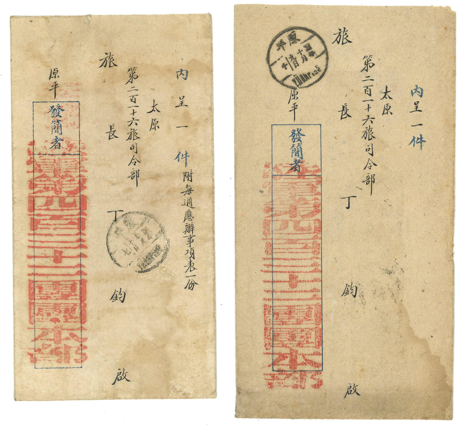 1934年一對陸軍第432團封寄太原第216旅司令部,貼帆船及孫像票,分別銷軍郵35局日戳及原平日戳。互為對比。(Image 1)